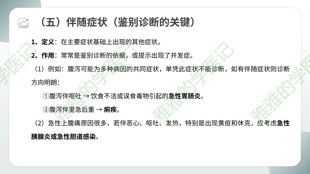 例如:腹泻伴呕吐 → 急性胃肠炎;腹泻伴里急后重 → 痢疾;急性上腹痛伴黄疸、休克 → 急性胰腺炎或胆道感染。