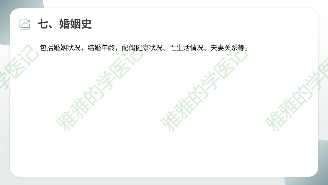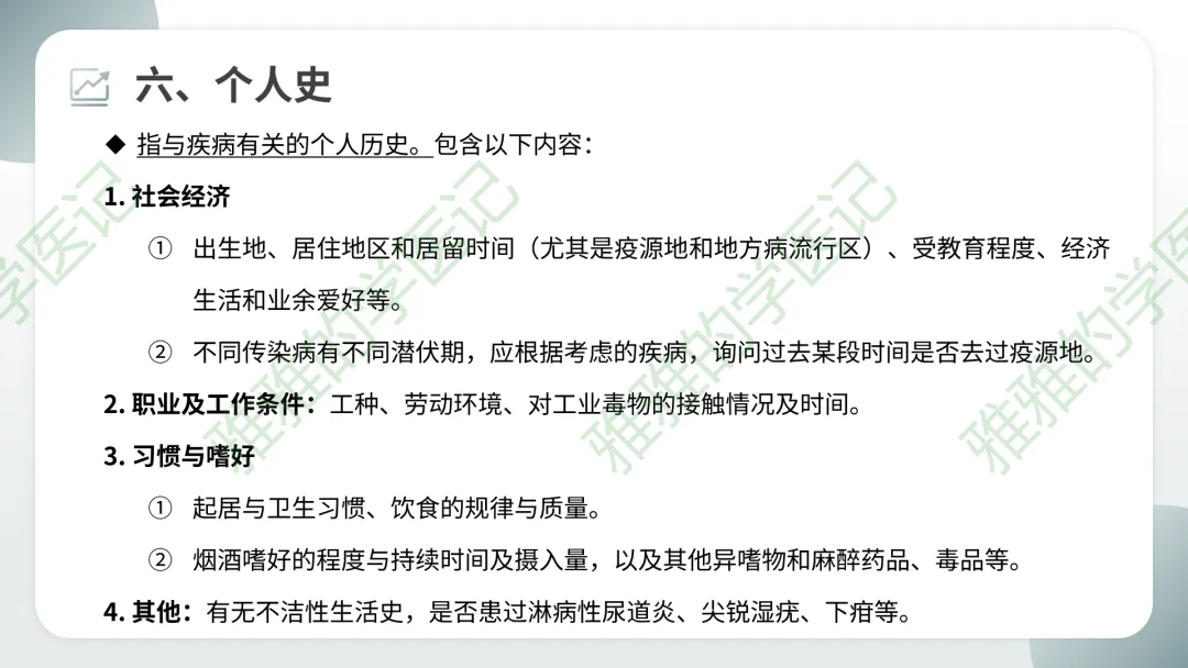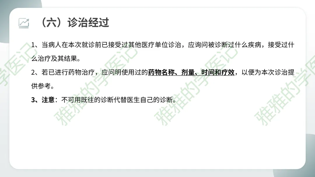 易错点:既往史与现病史的区分——现病史是本次疾病的发生发展,既往史是过去发生的但与本次无关或相关的疾病。但若过去疾病与本次有因果关系(如既往高血压导致现在心衰),应在现病史中提及病因,同时在既往史中详细记录。