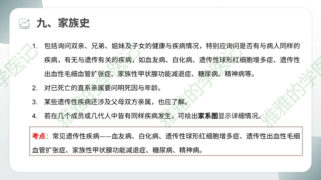 重点:有无与病人相同疾病;有无遗传性疾病(血友病、白化病、遗传性球形红细胞增多症、糖尿病、精神病等)。