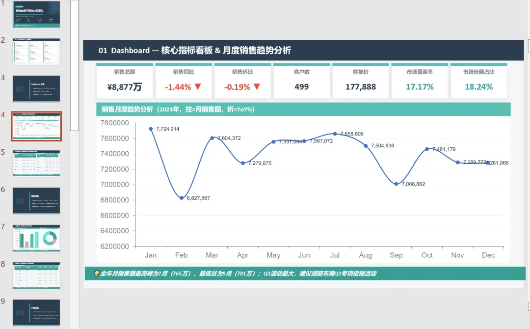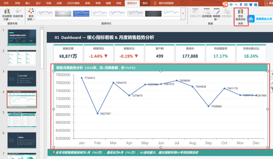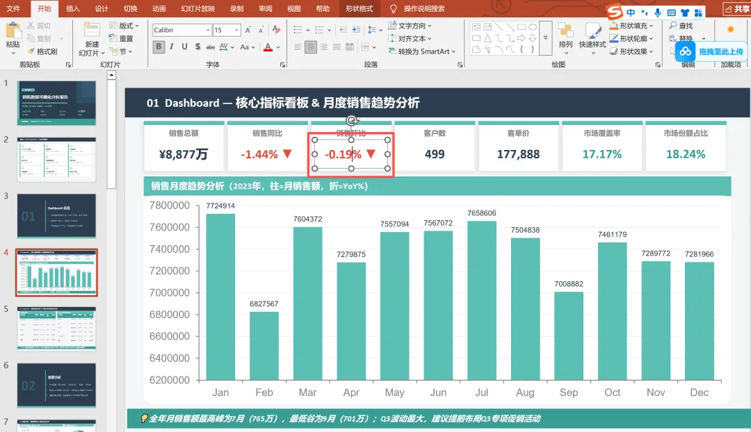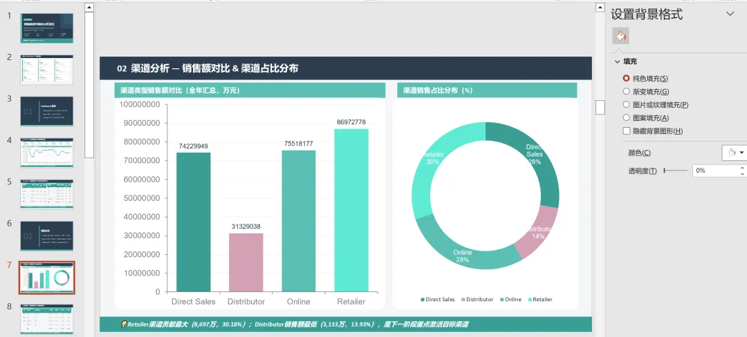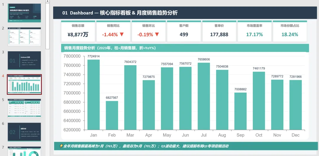 如下图是Claude AI+PPT销售数据可视化分析中的一页,