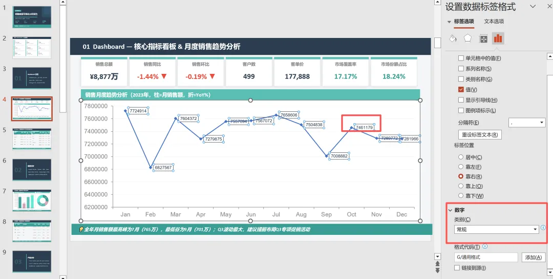 右击设计数据标签格式,可以对数据标签进行设置,如下图,在企业销售分析报告中,通常使用数字类别的