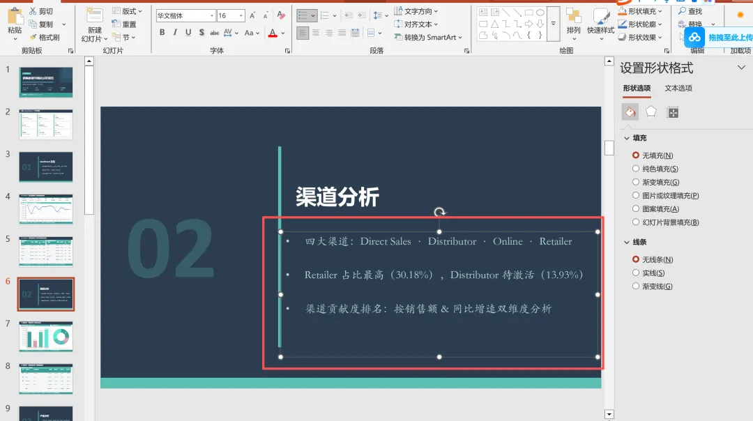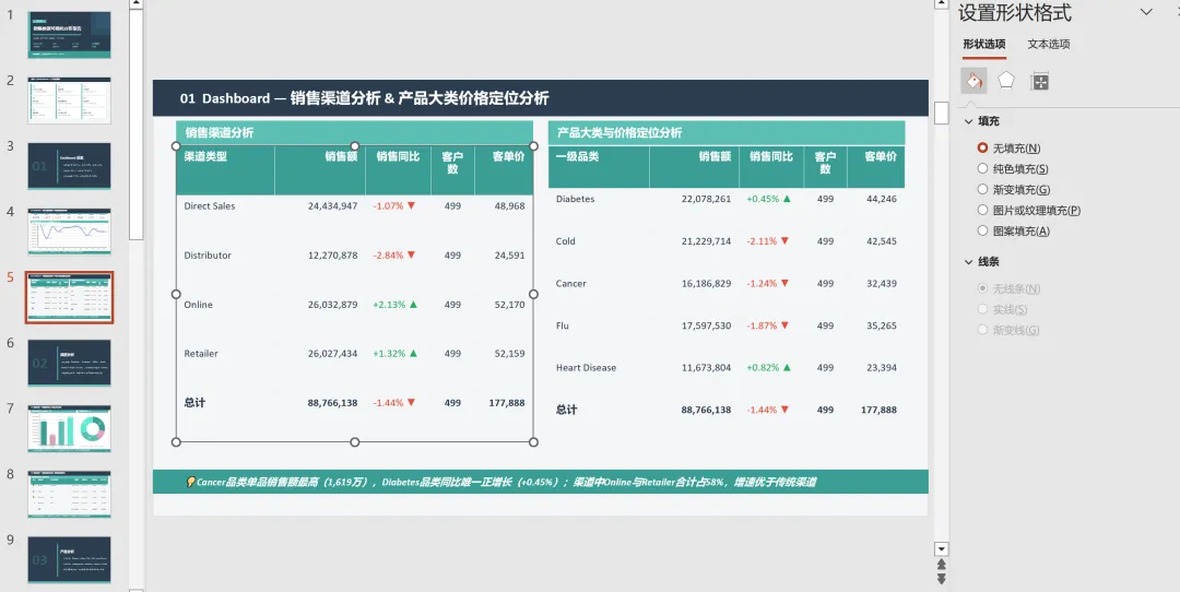 在具体的渠道与产品分析页面中,应用的是PPT中的表格设计,在AI Claude Skills生成的表格后,仅仅需要对表格的大小与间距适度调整,就能满足这页分析的应用。