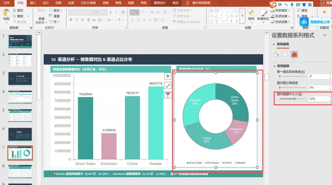 另一块圆环图的应用,在右侧的设置数据系列格式中,设计圆环的大小,这样得到的圆环图效果会更好些,如下图