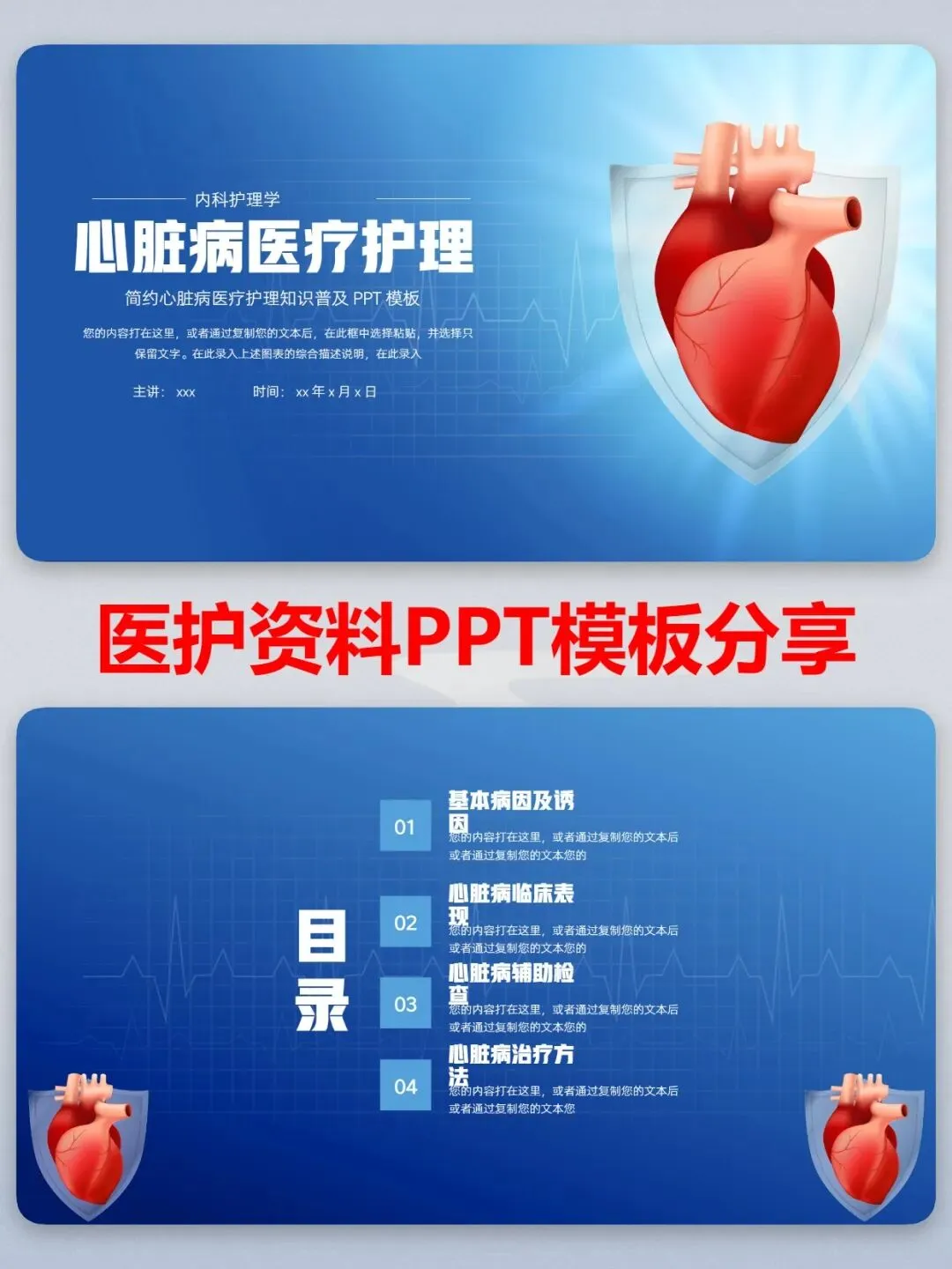 心脏病是内科常见危重疾病,也是护理工作重点关注对象。这套心脏病医疗护理PPT,贴合内科护理学教学大纲,适合护士培训、科室学习、健康宣教使用。