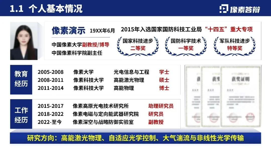 开篇直击定向能武器领域核心瓶颈(如光束控制精度不足、大气传输损耗大、复杂环境适应性差),以 “高效光束控制与大气传输补偿” 为桥定靶向;中段按 “个人基础 - 学术突破 - 支撑条件” 递进讲成果;结尾升华为定向能武器领域 “理论 - 技术 - 应用” 新范式,形成 “问题 - 突破 - 延展” 完整逻辑链。