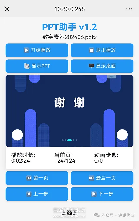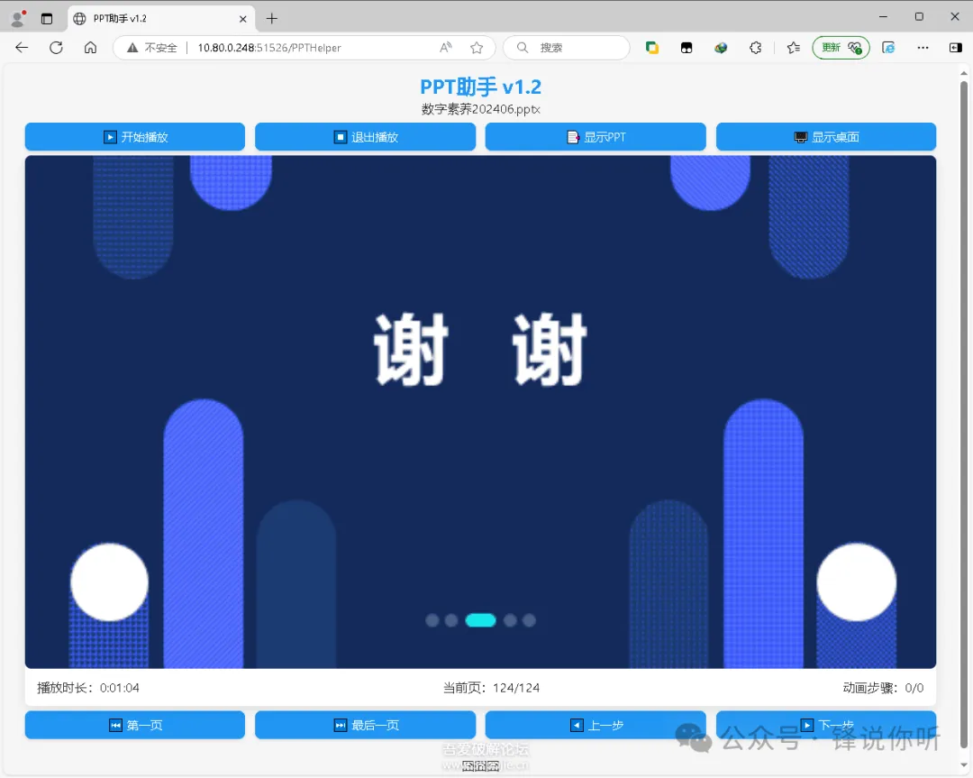 简介: PPT助手,PPT计时,倒计时,远程摇控,桌面监控,支持双屏 使用: 1、启动后,屏幕右上角显示PPT播放时间,任务栏显示小图标。 2、打开PPT,开始播放(PowerPoint可以远程开始停止播放,WPS可以翻页,不支持动画步骤显示)。 3、计时窗口或任务栏小图标右键菜单显示二维码,手机扫一扫,远程摇控(需同一网络)。 4、点击显示桌面按钮可多屏切换, 点击面面底部信息(囧囧囧)可远程操控鼠标。手机触屏单击左键,长按右键。 文件: PPTHelper.exe 主程序 Default.html 主页,可自定义网页UI,也可删除。 Sound.wav 倒计时声音提示文件,可替换。其它: 内置主页 http://127.0.0.1:51526/PPTHelper API列表 http://127.0.0.1:51526/PPTHelper/Api 服务端口 51526,51528 ,需防火墙放行 1、主程序界面回复“1060”获取下载