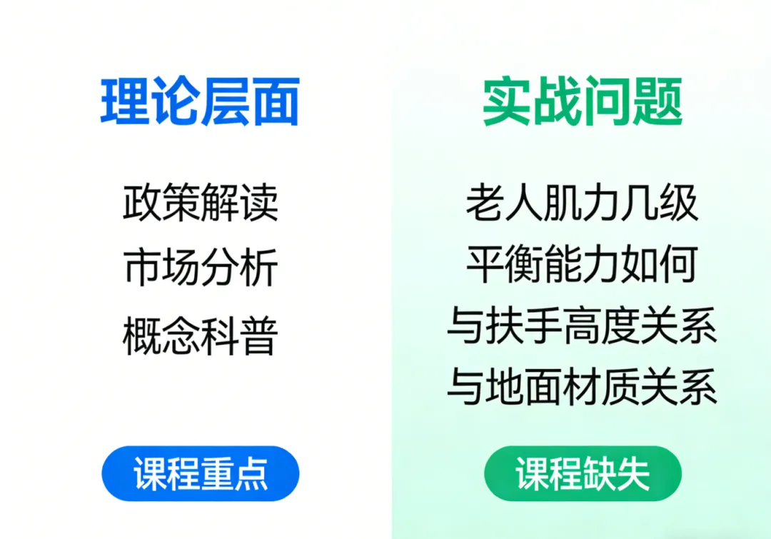 3.脱离场景:课程内容停留在政策解读、市场分析、概念科普层面,对 老人具体身体机能(如肌力几级、平衡如何)如何与扶手高度、地面材质发生关系 等核心实战问题,要么避而不谈,要么浅尝辄止。