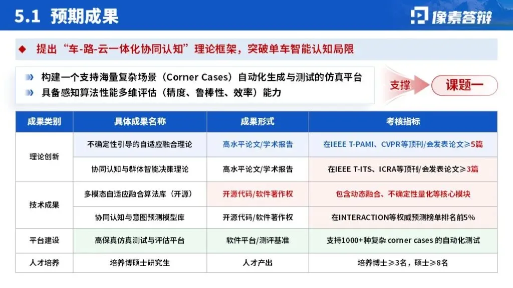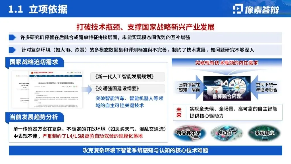 锚定立项价值针对复杂环境下单传感器局限与多模态融合瓶颈聚焦智能汽车与机器人领域为L4/L5级自动驾驶提供技术支撑构建全链条研究体系从多模态自适应融合感知到协同认知场景理解再到可靠性保障与系统集成形成基础理论到产业应用的完整路径实现多传感器时空对齐构建动态自适应融合模型揭示界面作用机制提升复杂环境下感知可靠性基于时空图神经网络建模多智能体交互采用不确定性量化技术为系统安全应用提供核心保障保障落地依托国家级科研平台与前期成果预期发表顶刊论文开发开源算法库为产业化应用奠定坚实基础若有侵权请随时联系我