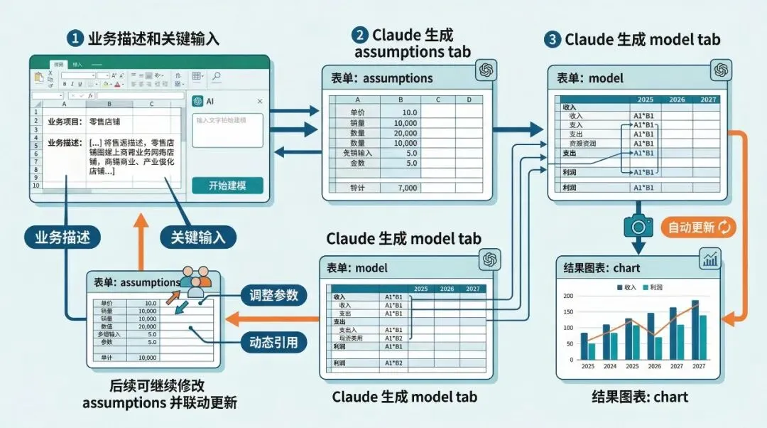 - • 他认为 Claude 在 Excel 里的真正价值,不是补几个公式,而是能理解业务背景并组织模型结构。