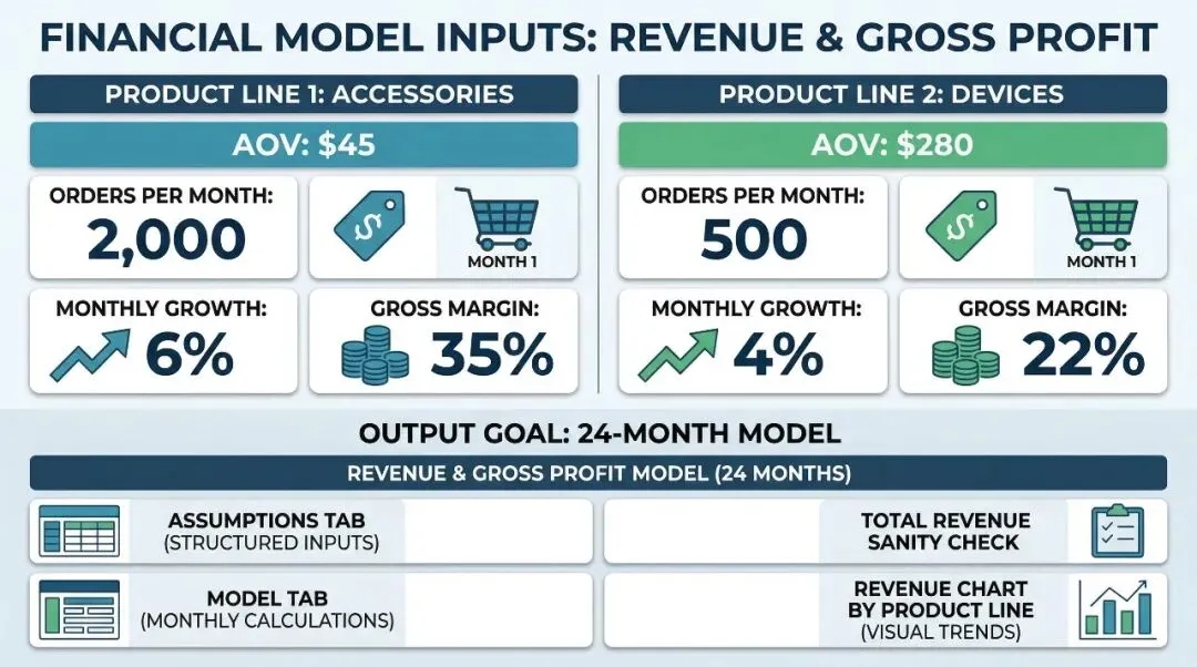 然后他要求 Claude 生成一个 24 个月的 revenue 和 gross profit 模型,并明确规定输出结构: