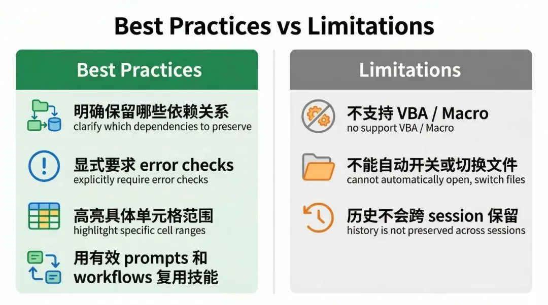 - • 视频明确指出当前限制包括:不支持 VBA / macro、不能开关或切换文件、会话历史不会跨 session 保存。