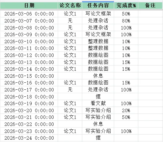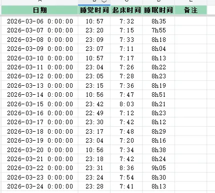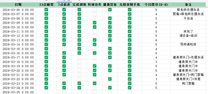 在本学期开始时,我自制了一份表格管理系统,执行到现在已经过去了19天,目前感觉自己已经完成了蜕变,从浑浑噩噩每天熬夜到11点,暴饮暴食,精神萎靡,到现在精力充沛,每天都干劲满满,活力四射。先附上我这19天来的执行情况,主要分为睡眠,论文,体重,基金,消费,习惯这六大板块。在制定表格的时候,我就意识到睡眠是我能否坚持执行下去的根基,如果每天不能够规律的作息,那精神上就不足以支持我专注的去执行。所以我给自己定的是每天十一点睡觉,早上七点起,保证能够有8个小时的睡眠时间。论文这个板块是我需要改进的,在写论文的时候,心流状态的保持时间一般只能维持两个小时,尽管白天大部分时间都在工位,但总感觉进度太慢,这是本周要重点提升的地方,我复盘总结时发现,我在写论文时总是无意识的把手机放旁边,当我想要休息的时候,就喜欢划拉划拉手机,然后点进短视频,两个小时出不来,这是导致我论文进展慢的核心原因。这周准备在写论文时把手机放在看不到的地方,加快进度,尝试一周看看方法是否可行。