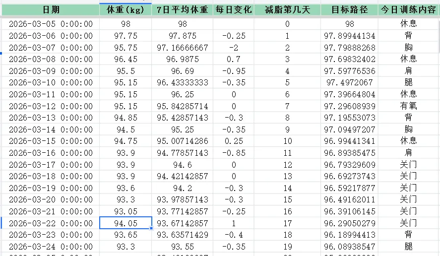 体重这部分是执行的比较好的,上周健身房纠纷关门了一周,不然应该还会再降一些,从开始记录体重之后,在饮食方面也就保持克制了,会自主的排除掉高油高盐的食物,并且戒糖戒奶茶,所以目标的执行情况还是不错的。目前还是很有信心能够达到预期目标。