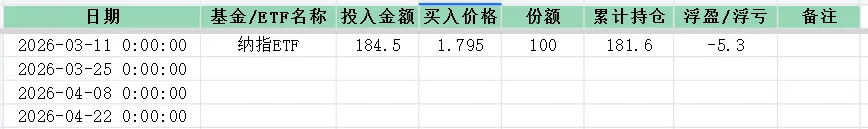 今年想要训练自己对市场的关注度,同时培养自己理财的能力,但是目前手中闲钱不多,今年准备拿出5000元分一年期定投纳指,最后是赚是赔不重要,即使全部赔光也不影响我的日常生活。自从买进之后,每天抽时间就想打开看看,日常科研生活中满满的已经对基金股票投入了些许关注,同时我还自选了许多我比较看好的股,但是没有投入的打算。