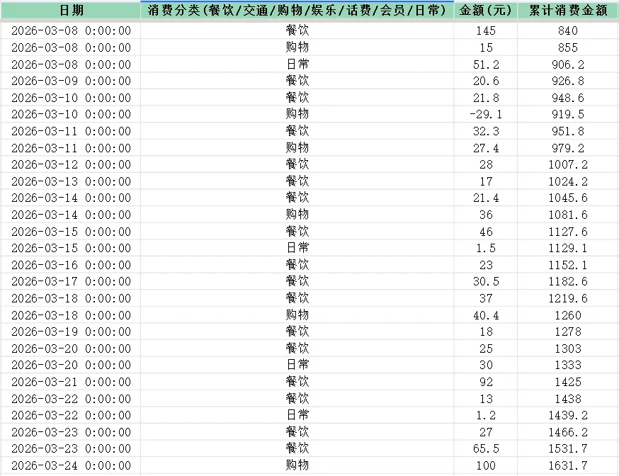 记录自己的消费,主要是想知道我一个月能够花费多少钱,我对自己一个月的消费一直很好奇,虽然花钱不会大手大脚,但是我想要从消费中看出我自己的开销各自的占比是多少,这对了解我自身的习性是一个好的方法。