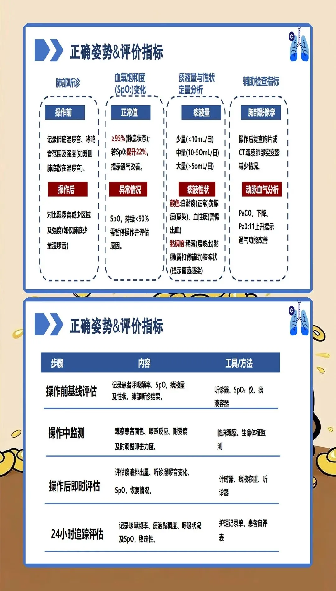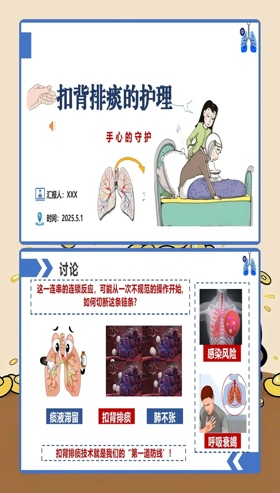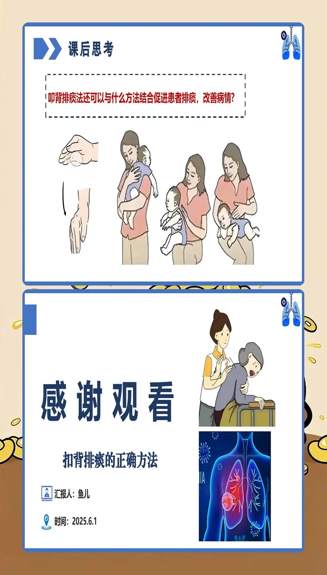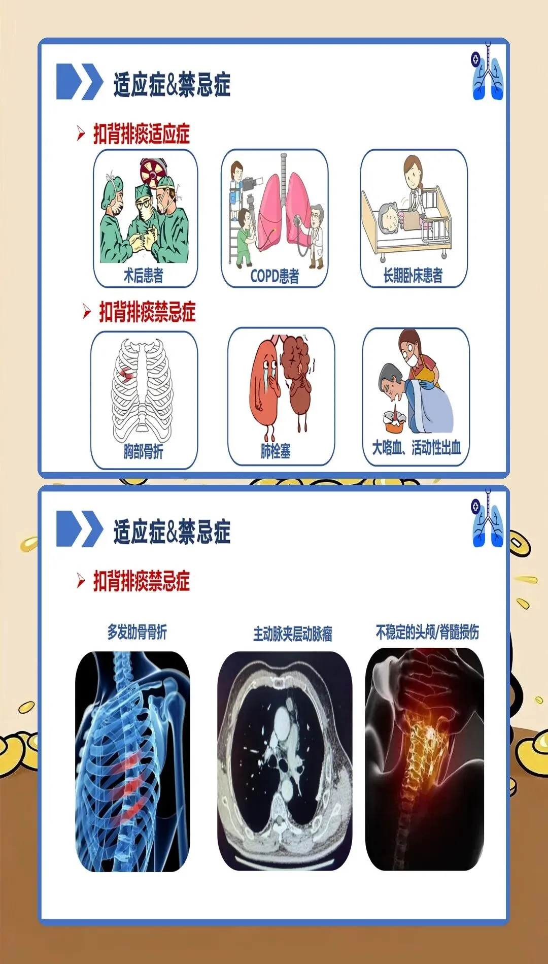 特殊患者的扣背排痰需要个体化策略。对于婴幼儿和儿童患者,力量要适当减轻,可使用手掌轻拍或震动排痰器。对于老年患者,要注意骨质疏松,避免用力过猛导致肋骨骨折。对于术后患者,要避开手术切口,根据手术类型选择合适的体位。对于机械通气患者,可在呼吸机支持下进行扣背,注意管路安全。对于意识障碍患者,要加强监测,防止误吸。对于气管切开患者,叩击后要及时吸痰,保持气道通畅。对于咯血患者,待咯血停止后再考虑扣背排痰,避免再次出血。特殊患者的操作需要更加谨慎,必要时请呼吸治疗师会诊,制定个体化的排痰方案。