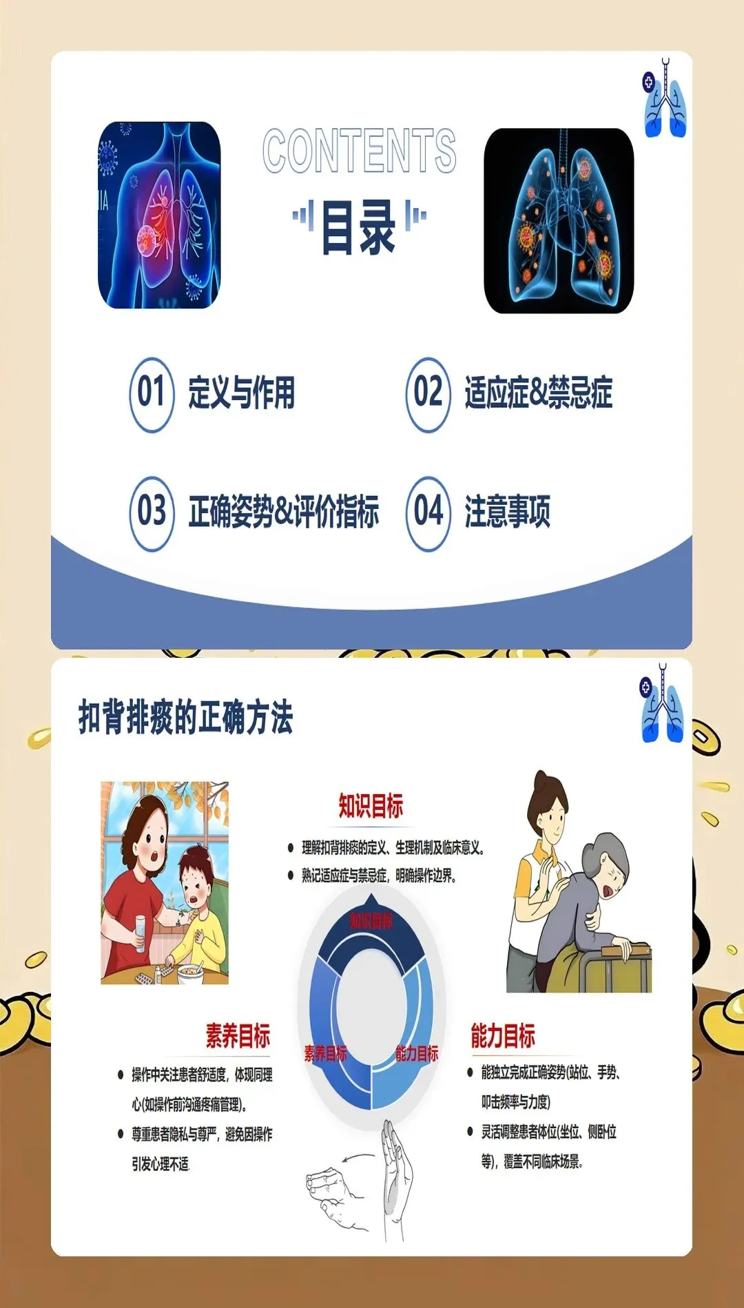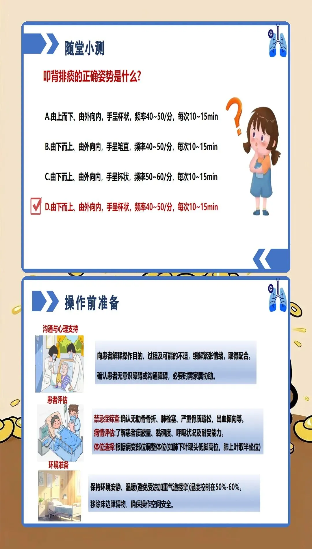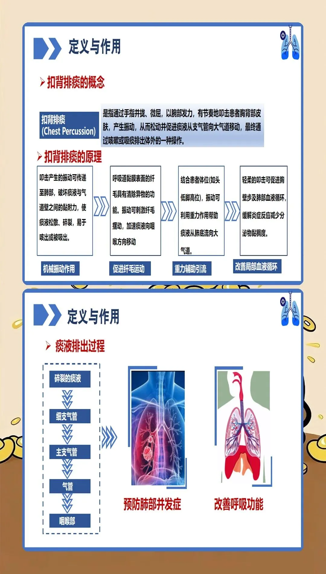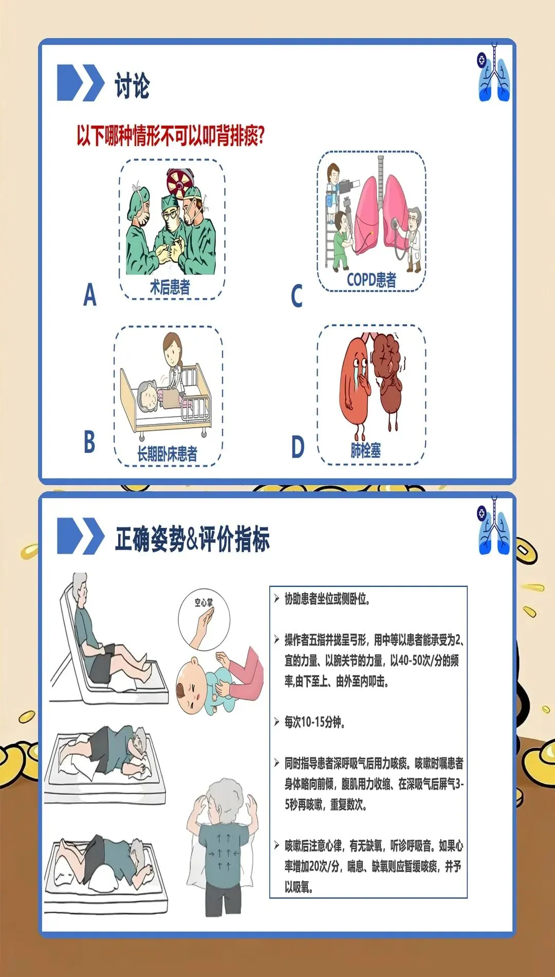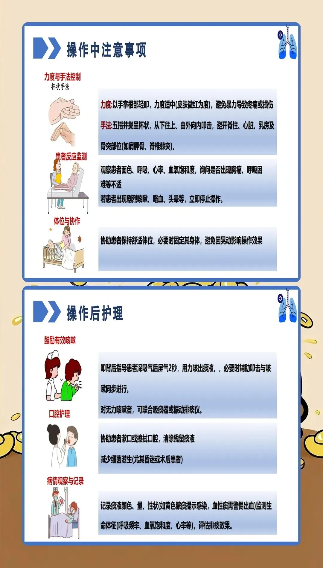 不同部位的扣背技巧有所差异。对于右上肺病变,患者可采取坐位或左侧卧位,叩击右侧背部;对于左上肺病变,患者可采取坐位或右侧卧位,叩击左侧背部。对于下叶病变,患者可采取半卧位或坐位前倾位,叩击下背部。对于肺底部病变,患者可采取头低脚高位,注意防止误吸。护理人员要根据病变部位选择合适的体位和叩击区域,确保叩击准确作用于目标肺段。对于双肺广泛病变,可分侧进行,避免患者过度疲劳。叩击时要注意避开手术切口、引流管、创伤部位等敏感区域,避免引起疼痛或损伤。