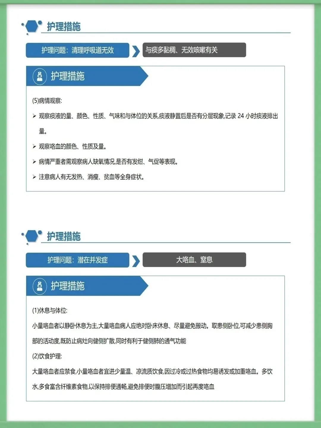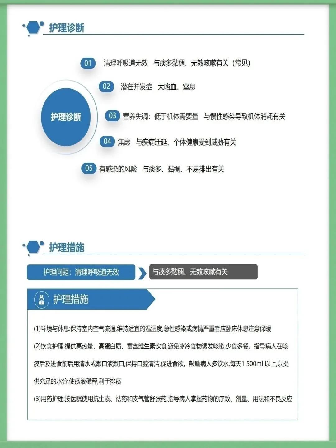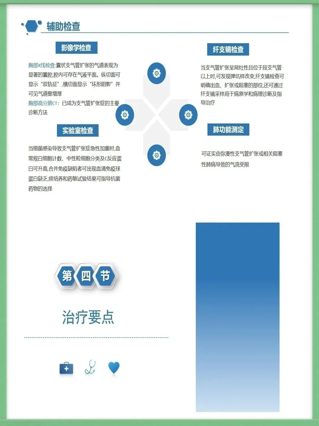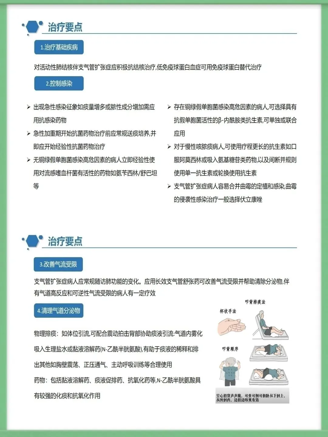 该病的辅助检查中,胸部高分辨CT是主要诊断方法,结合血常规、痰培养、纤支镜及肺功能测定,可明确病情与病因,为治疗提供精准依据,影像学上典型表现为双轨征、环形阴影。临床治疗需围绕基础病治疗、控制感染展开,同时通过支气管舒张药改善气流受限,借助体位引流、黏液溶解药清理气道,咯血者对症用药,内科治疗无效的局限性病变可考虑外科手术。护理工作的核心诊断包括清理呼吸道无效、潜在大咯血窒息等,护理中需保证环境适宜,给予高热量饮食并鼓励饮水,规范用药,严格按流程开展体位引流,密切观察痰液与咯血情况。针对大咯血窒息并发症,需让患者取患侧卧位,大量咯血者禁食,备好急救设备,一旦出现窒息征象,立即取头低脚高俯卧位排出血块,必要时负压吸引或气管插管。做好健康指导是病情管控的关键,需指导患者预防呼吸道感染,掌握有效排痰方法,养成良好生活习惯,自我监测病情,出现症状加重时及时就诊,以此降低急性发作风险,维护肺功能。以上就是支气管扩张病人护理的核心内容,感谢大家的聆听。需要模板请进后台⬇️⬇️⬇️