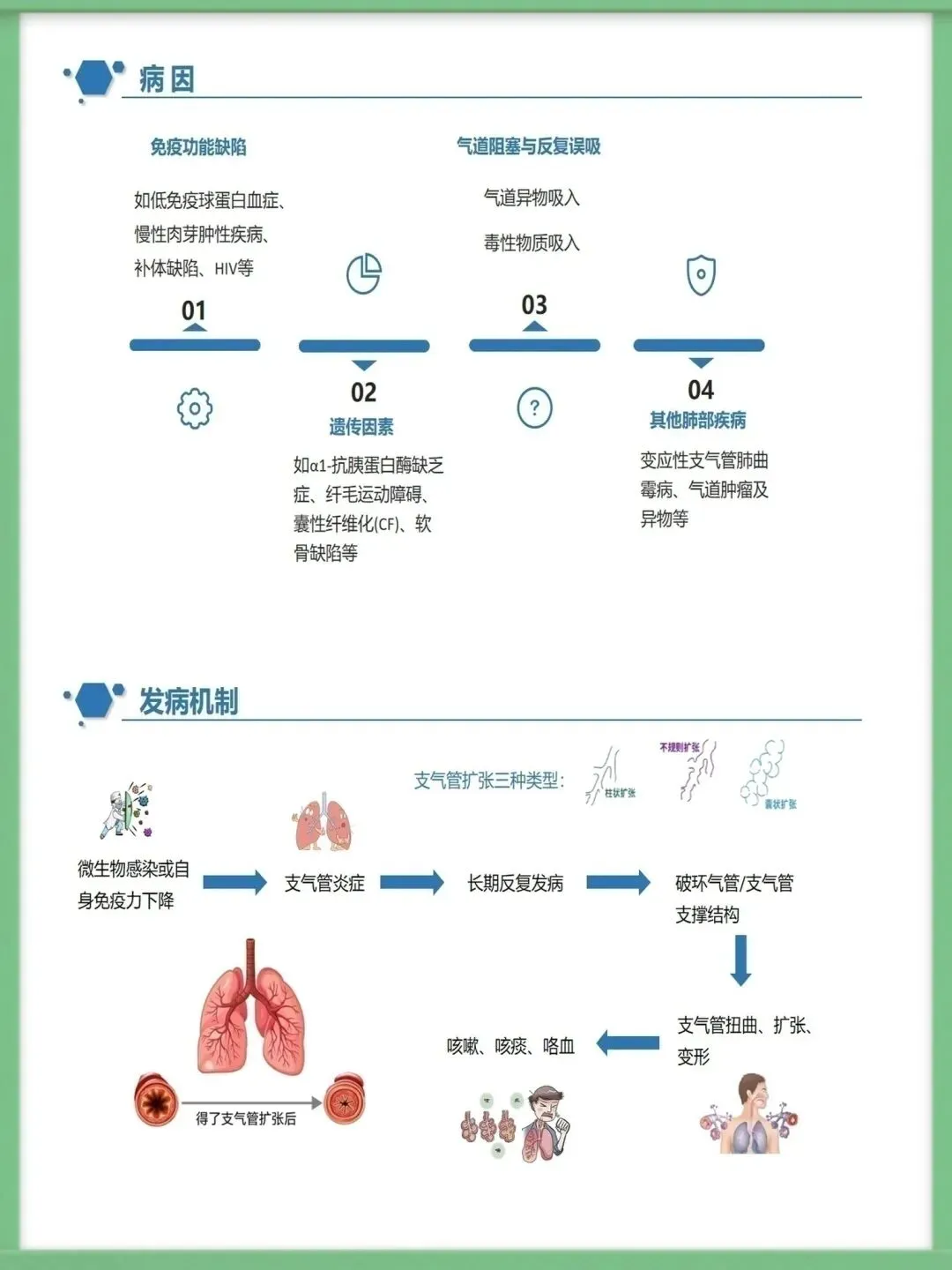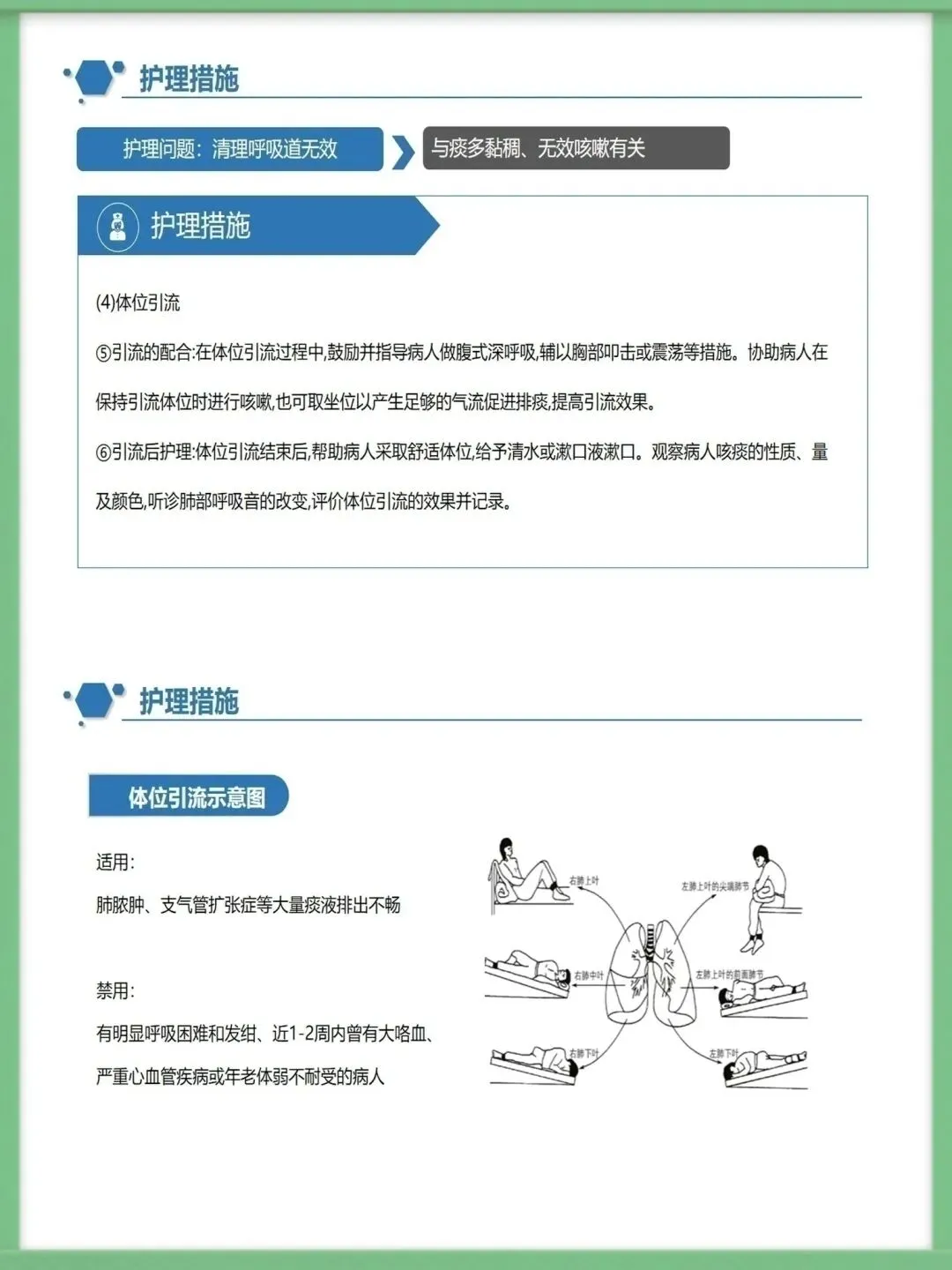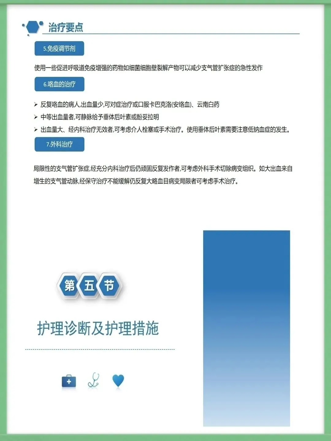 该病的辅助检查中,胸部高分辨CT是主要诊断方法,结合血常规、痰培养、纤支镜及肺功能测定,可明确病情与病因,为治疗提供精准依据,影像学上典型表现为双轨征、环形阴影。临床治疗需围绕基础病治疗、控制感染展开,同时通过支气管舒张药改善气流受限,借助体位引流、黏液溶解药清理气道,咯血者对症用药,内科治疗无效的局限性病变可考虑外科手术。护理工作的核心诊断包括清理呼吸道无效、潜在大咯血窒息等,护理中需保证环境适宜,给予高热量饮食并鼓励饮水,规范用药,严格按流程开展体位引流,密切观察痰液与咯血情况。针对大咯血窒息并发症,需让患者取患侧卧位,大量咯血者禁食,备好急救设备,一旦出现窒息征象,立即取头低脚高俯卧位排出血块,必要时负压吸引或气管插管。做好健康指导是病情管控的关键,需指导患者预防呼吸道感染,掌握有效排痰方法,养成良好生活习惯,自我监测病情,出现症状加重时及时就诊,以此降低急性发作风险,维护肺功能。以上就是支气管扩张病人护理的核心内容,感谢大家的聆听。需要模板请进后台⬇️⬇️⬇️