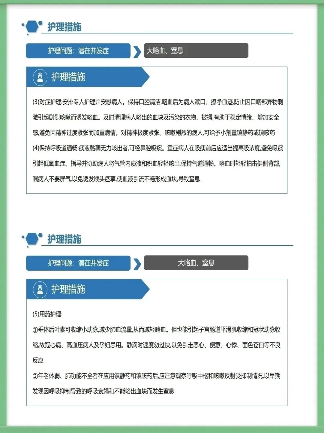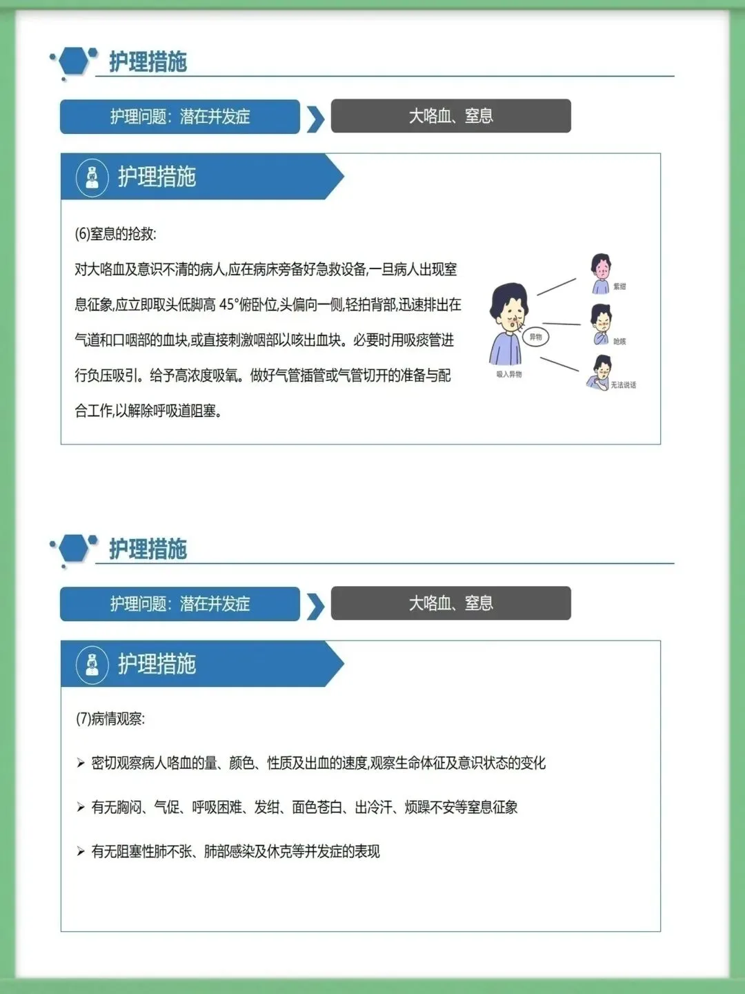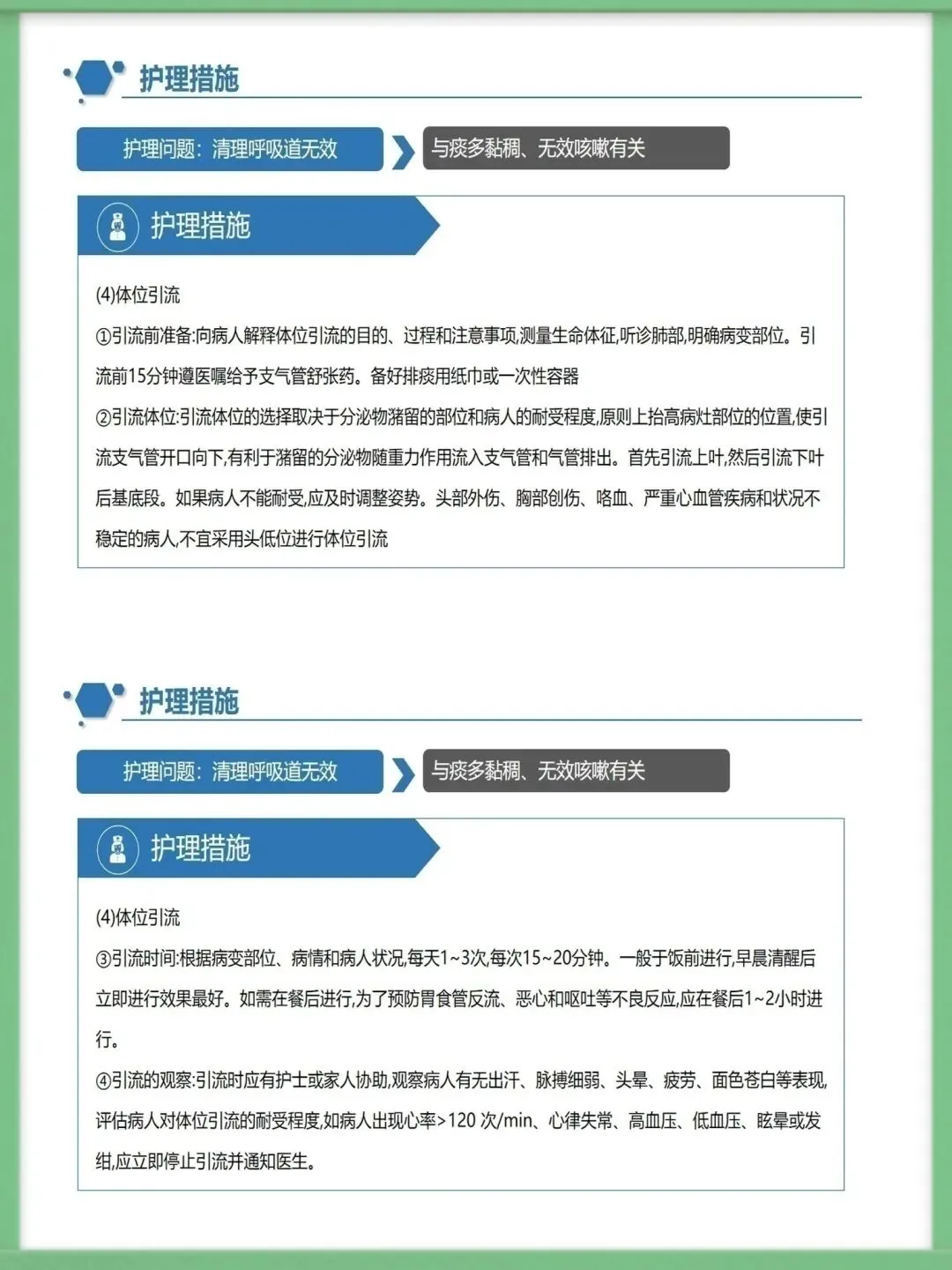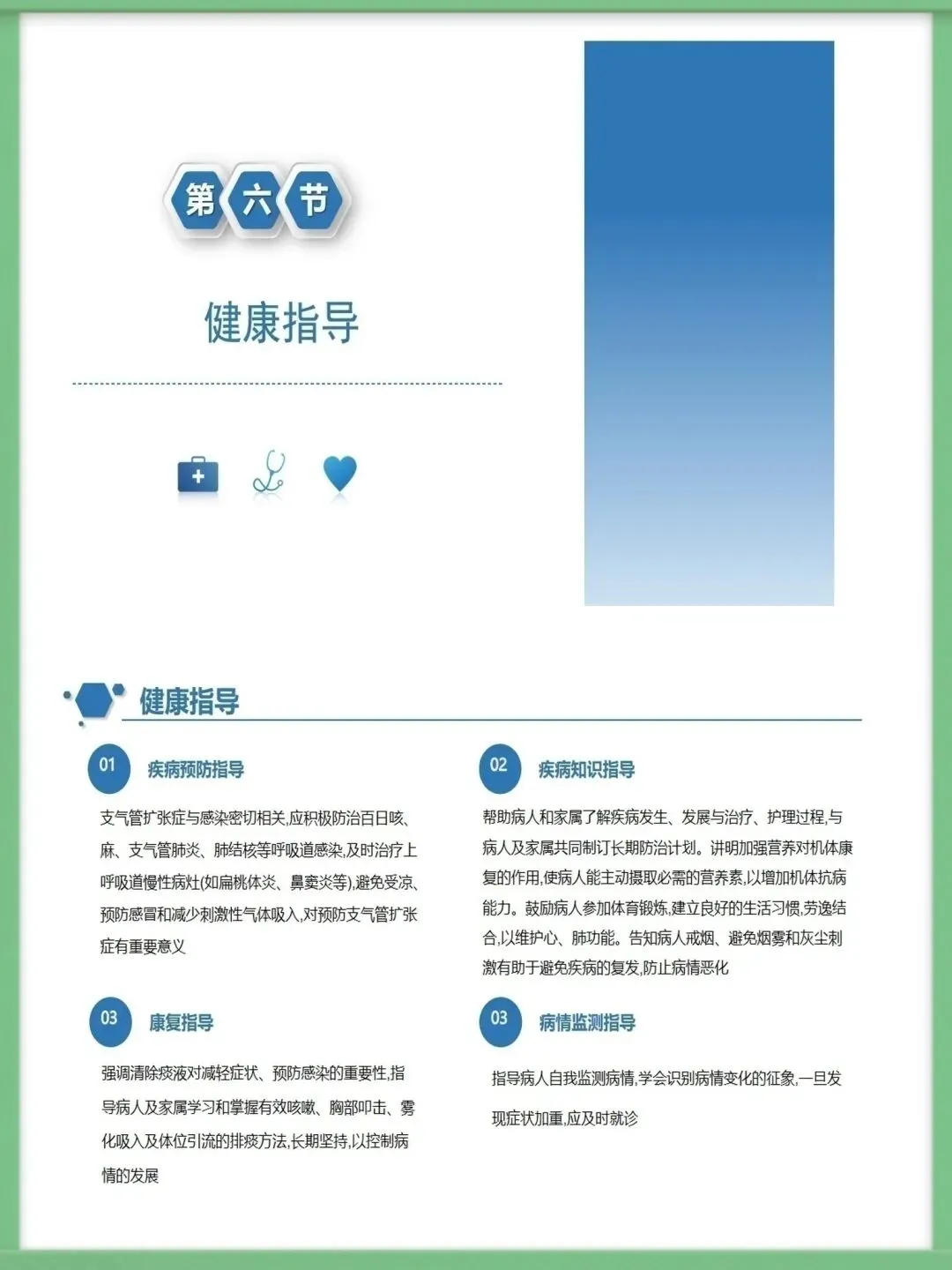 该病的辅助检查中,胸部高分辨CT是主要诊断方法,结合血常规、痰培养、纤支镜及肺功能测定,可明确病情与病因,为治疗提供精准依据,影像学上典型表现为双轨征、环形阴影。临床治疗需围绕基础病治疗、控制感染展开,同时通过支气管舒张药改善气流受限,借助体位引流、黏液溶解药清理气道,咯血者对症用药,内科治疗无效的局限性病变可考虑外科手术。护理工作的核心诊断包括清理呼吸道无效、潜在大咯血窒息等,护理中需保证环境适宜,给予高热量饮食并鼓励饮水,规范用药,严格按流程开展体位引流,密切观察痰液与咯血情况。针对大咯血窒息并发症,需让患者取患侧卧位,大量咯血者禁食,备好急救设备,一旦出现窒息征象,立即取头低脚高俯卧位排出血块,必要时负压吸引或气管插管。做好健康指导是病情管控的关键,需指导患者预防呼吸道感染,掌握有效排痰方法,养成良好生活习惯,自我监测病情,出现症状加重时及时就诊,以此降低急性发作风险,维护肺功能。以上就是支气管扩张病人护理的核心内容,感谢大家的聆听。需要模板请进后台⬇️⬇️⬇️