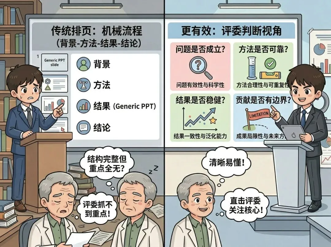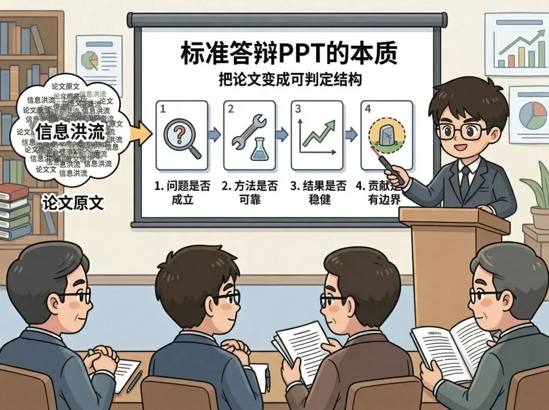 博士答辩PPT最常见的问题,不是页数太多,而是逻辑对象错了:你在“展示论文”,评委却在“做学术判定”。
