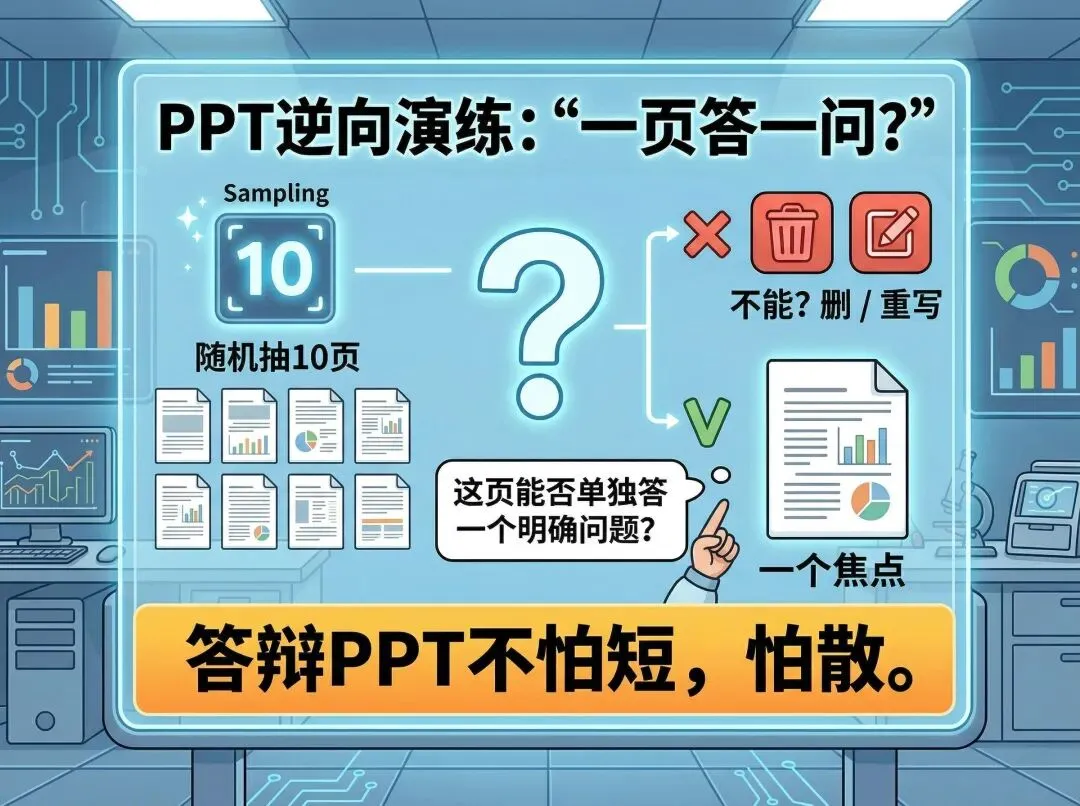 你可以先做一次“逆向演练”:随机抽10页,问自己“这页能否单独回答一个明确问题”。若不能,就删或重写。答辩PPT不怕短,怕散。