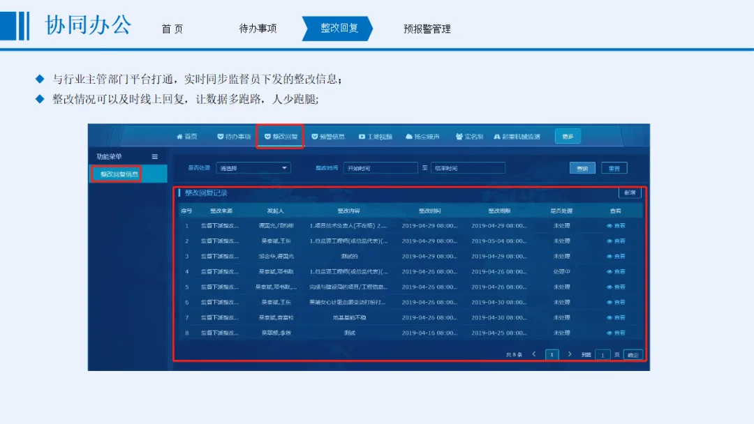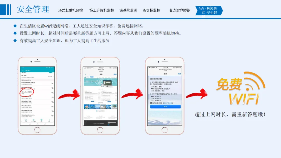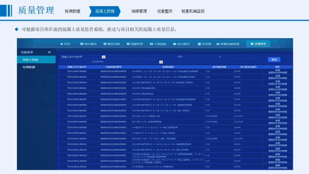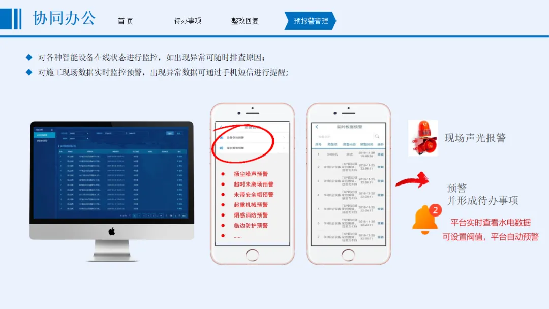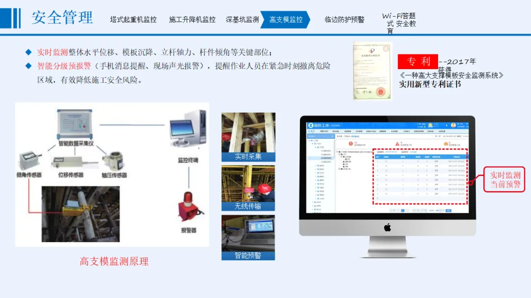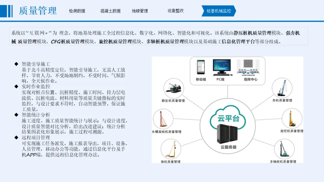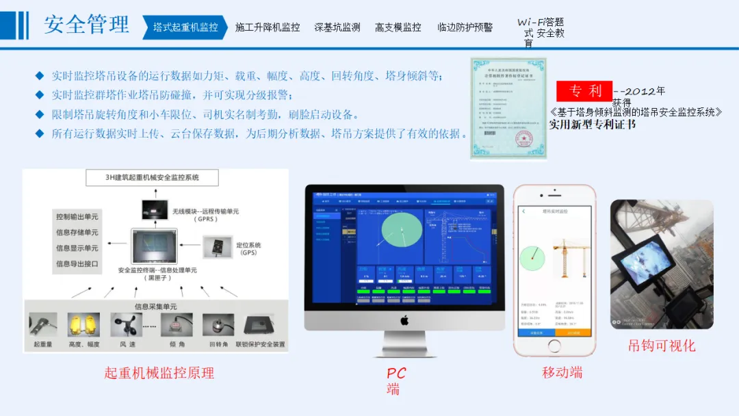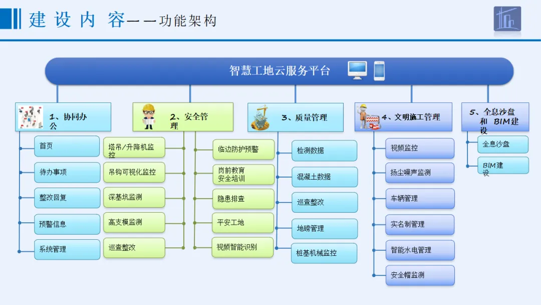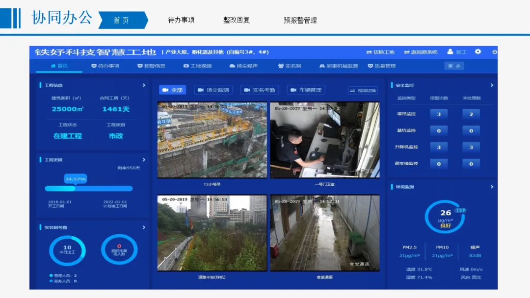 方案以“感知更透彻、互联更全面、智能更深入”为核心目标,涵盖协同办公、安全管理、质量管理、文明施工管理、全息沙盘和BIM建设五大核心模块。安全管理方面,实时监控起重机械、深基坑、高支模等重大危险源,通过智能传感与AI识别实现分级预警;质量管理聚焦材料检测、混凝土数据、桩基施工等关键环节,依托北斗定位与智能算法保障施工精度;文明施工管理整合视频监控、扬尘噪声监测、车辆与实名制管理,联动喷淋设备实现环保管控;协同办公支持移动化操作,打通整改闭环与跨部门数据流转。