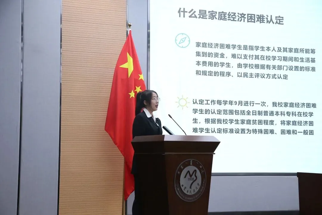 本次比赛分为初赛和决赛,来自教育科学学院等十个学院的学生代表进入了决赛,同学们围绕家庭经济困难学生认定、国家奖助学金、生源地信用助学贷款、服兵役国家教育资助和勤工助学、临时困难补助、减免学费等助项目内容,为同学们做了详细讲解,同学们ppt设计完整、准确,结构合理,逻辑顺畅,演讲者语言表达流畅,精神饱满,能较好的运用姿态、动作、手势、表情,表达对演讲稿的理解,具有较强的感染力和吸引力。最终来自生命科学与食品学院的闫文锦摘得比赛桂冠。