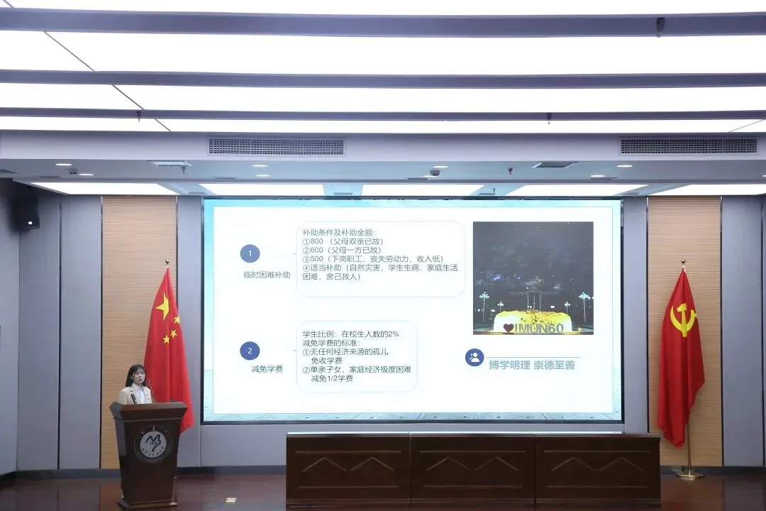 为了加大对学生资助政策的宣传力度,确保国家对大学生的各项资助政策得到更好的贯彻和落实,进一步维护教育的公平、公正,顺利推进我校学生资助工作的开展。按照上级文件要求,结合我校的实际情况,5月14日晚,学生处在校图书馆大报告厅开展首届资助政策ppt演讲比赛,此项比赛也是“第四届资助育人主题系列教育活动”中的其中一项。学生工作处思想教育科科长刘海波、国防教育科科长海日悍、资助中心主任昝桂丽、资助中心老师卜祥川、资助中心老师宝山担任本次比赛的评委,各学院辅导员代表和学生代表观看了比赛。
