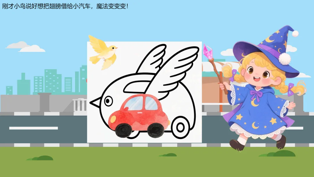 小鸟说:‘小汽车,别着急,我好像把我的翅膀借给你呀!’”