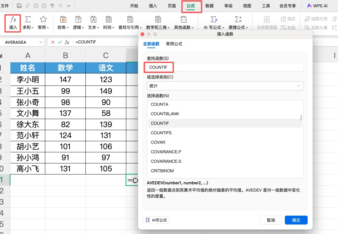 点击顶部菜单栏「公式」,选择「插入函数」,在函数类别中选「统计」,找到COUNTIF并确定;