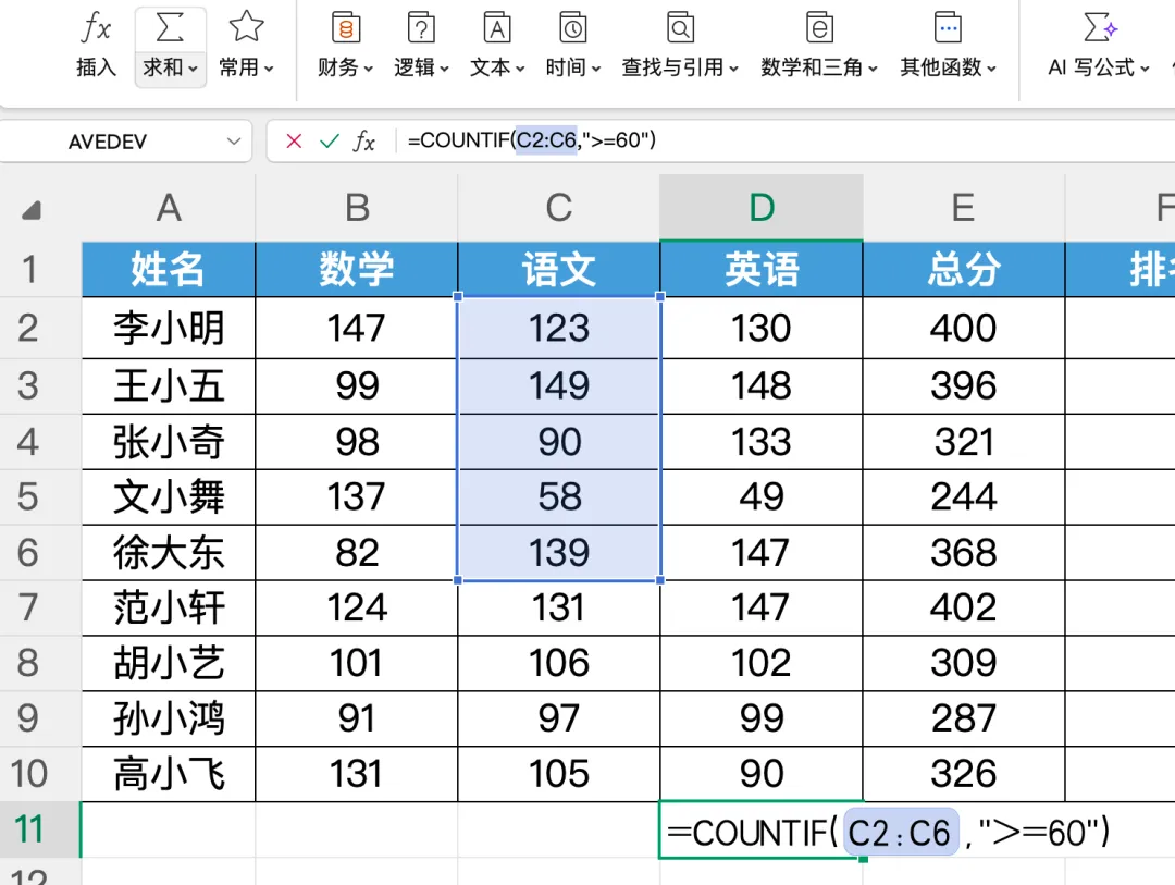 可直接在单元格输入公式,无需手动插入函数,语文及格人数直接输入=COUNTIF(C2:C6,">=60"),回车即出结果,更高效;