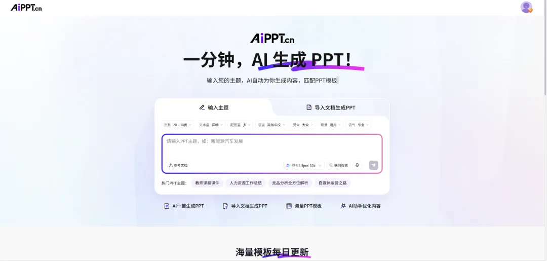 AI一键生成PPT:只需输入主题或关键词,AiPPT就能迅速为你生成完整的PPT框架,包括大纲、文案和排版,省时又省力!