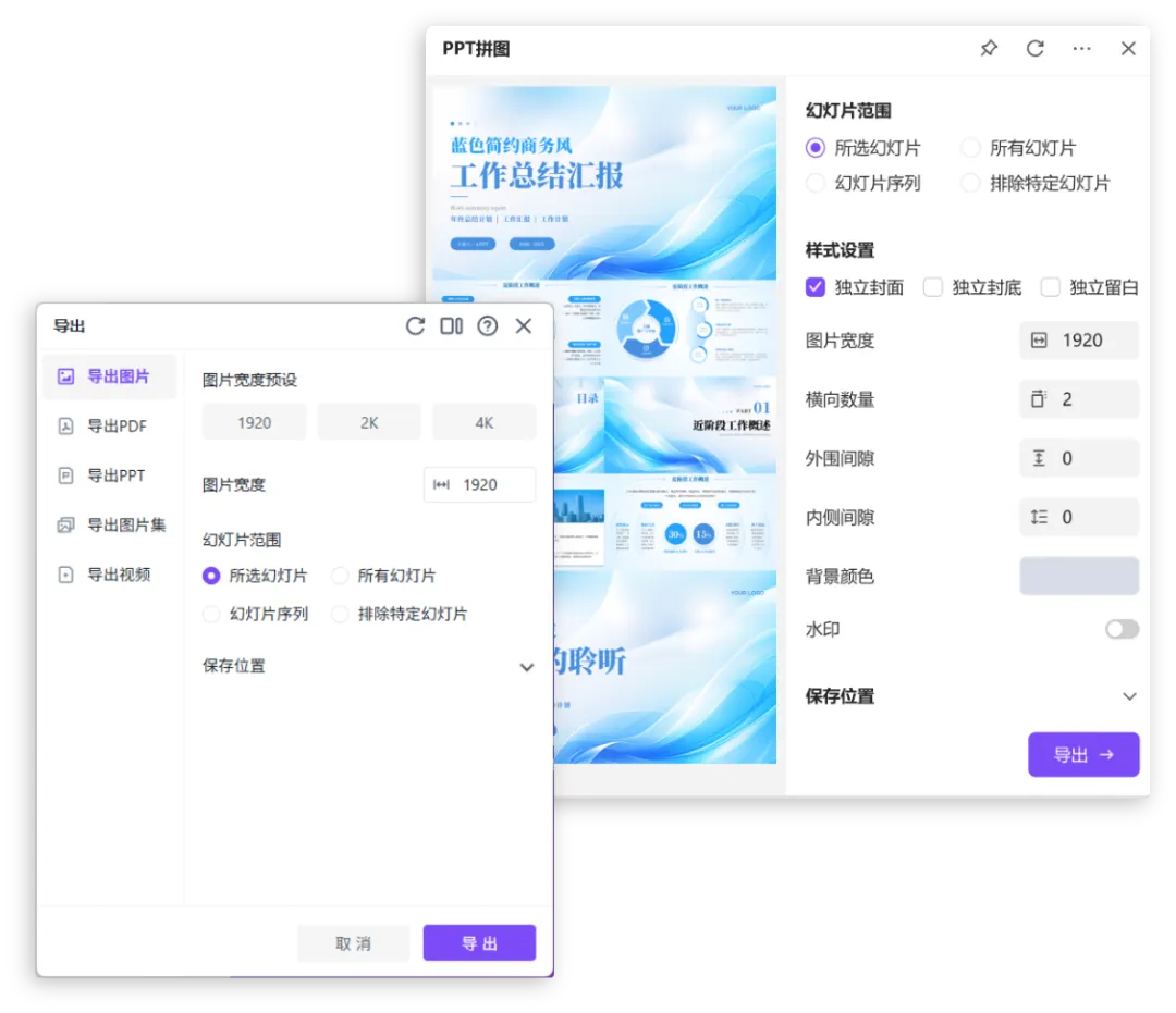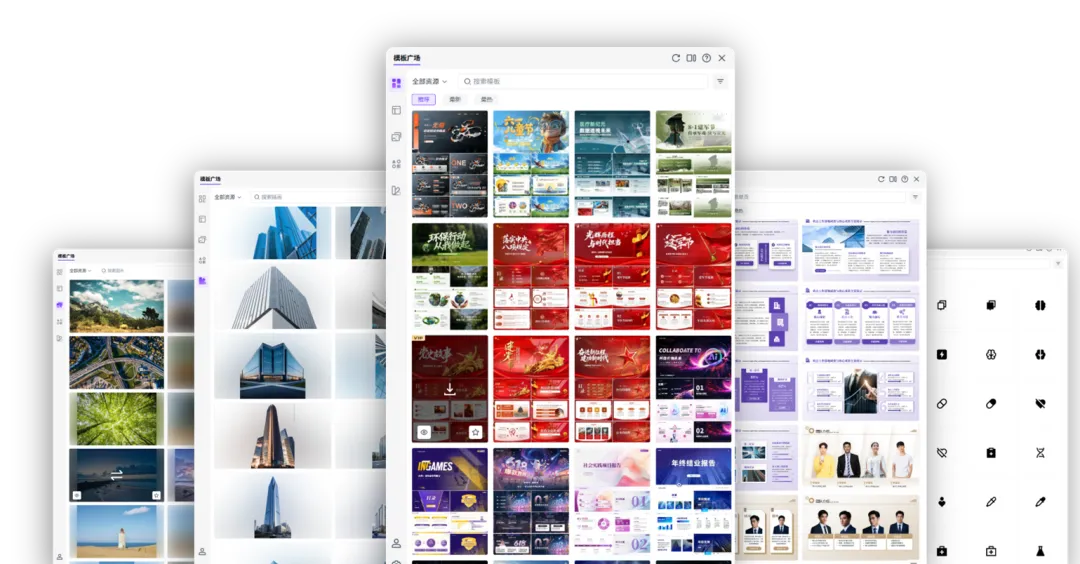进入素材库挑选喜欢的图片、图标等装饰 PPT ,利用模板调整版式,完成后导出即可,全程简单易操作 。