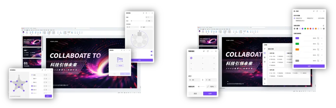 海量模板库:拥有超10万套定制级模板,覆盖商务、教育、科技等22大场景和21个行业,支持一键更换模板和配色。