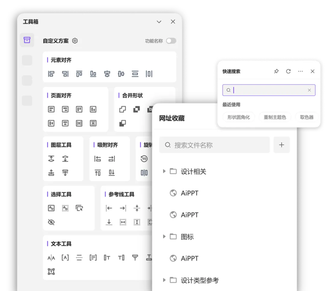 支持快速搜索功能定位,无需翻找菜单;智能 PPT 与图片压缩,让文件更轻更快;取色器便捷取色,网址收藏与工具箱助你打造个性化工作台。
