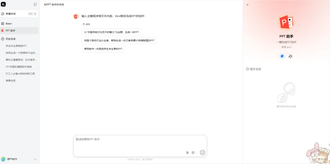 进入 Kimi 平台,清晰输入你的 PPT 需求指令,例如 “制作一份关于新能源汽车发展趋势的 PPT ,用于行业研讨会分享,需要包含市场现状、技术突破、未来展望三个板块,风格偏专业商务” 。