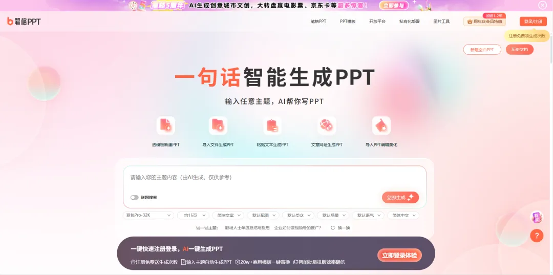 登录笔格 AIPPT ,在主题输入框填写 PPT 主题,像 “家庭旅行规划 PPT”“企业产品推广 PPT ” 。