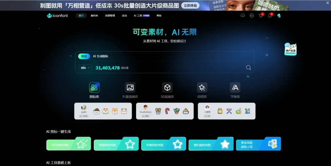 功能亮点:宝藏级素材库,格式超全:SVG、AI、PNG 随意下,还有矢量插画、3D 插画、LOTTIE 动效、字体库 … 无需翻墙,登录就能用,日常做图、做 PPT 直接薅素材。像 PPT 里加些简约图标装饰页面,或者用动效让内容更生动 。操作步骤: