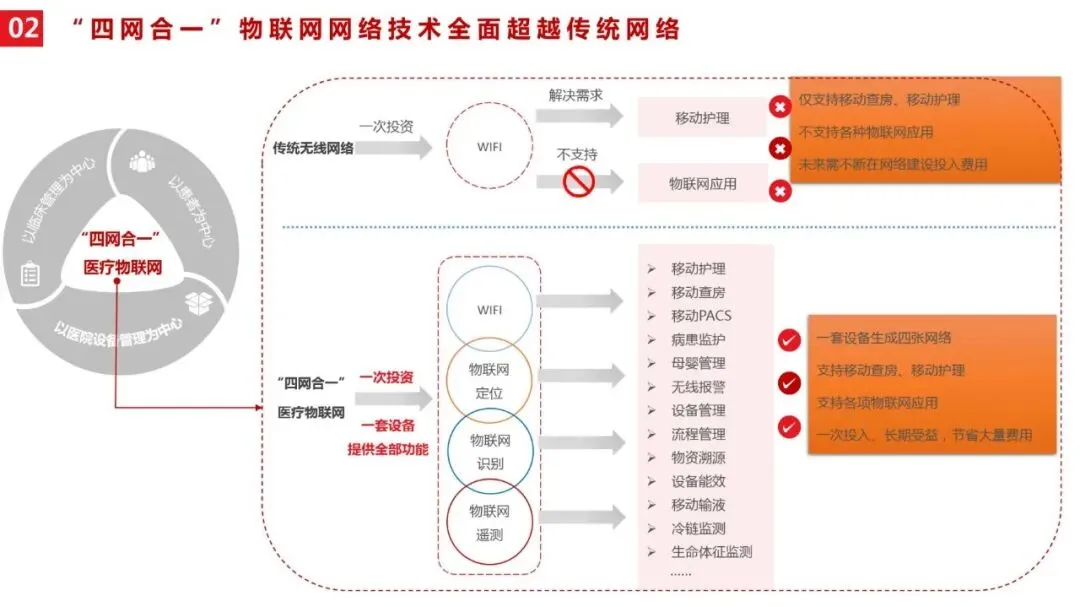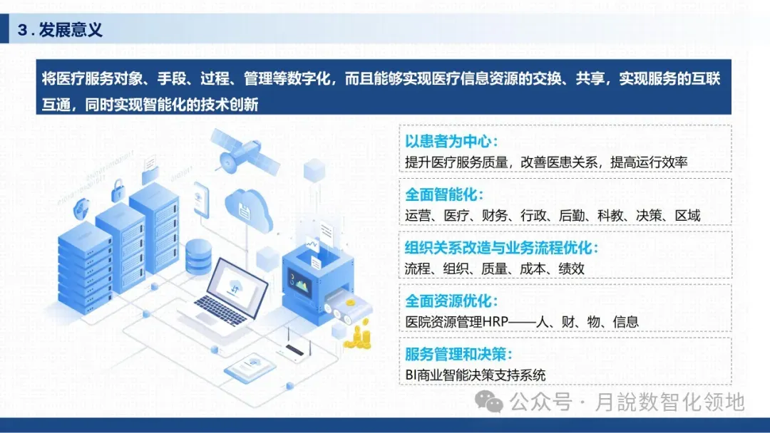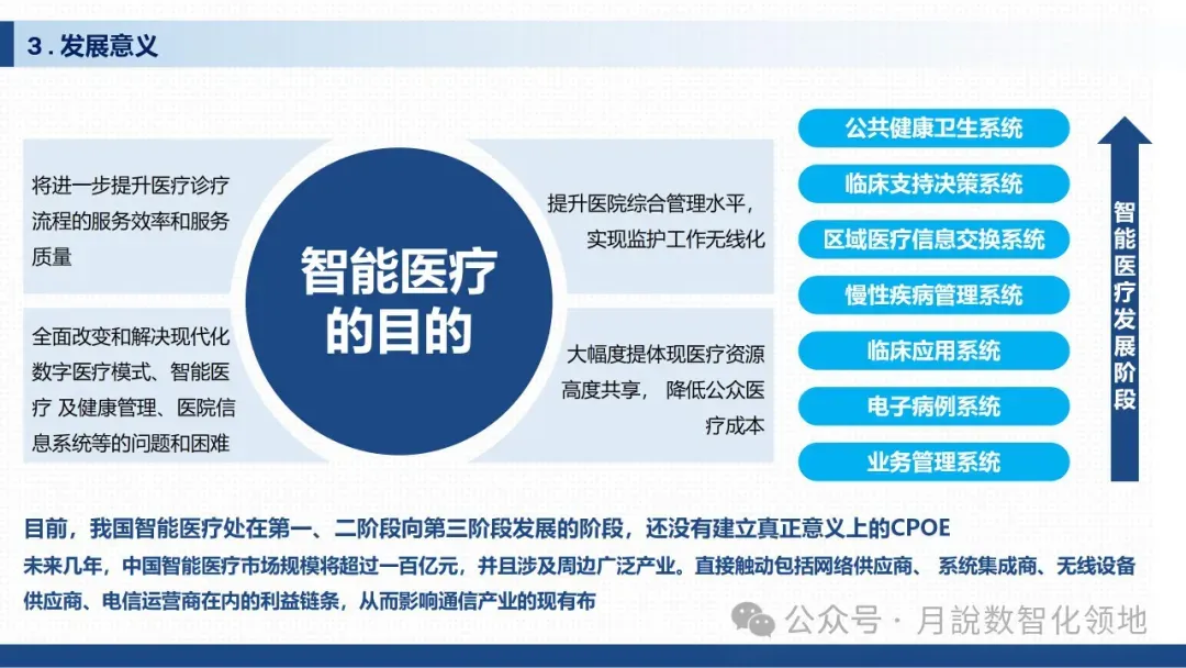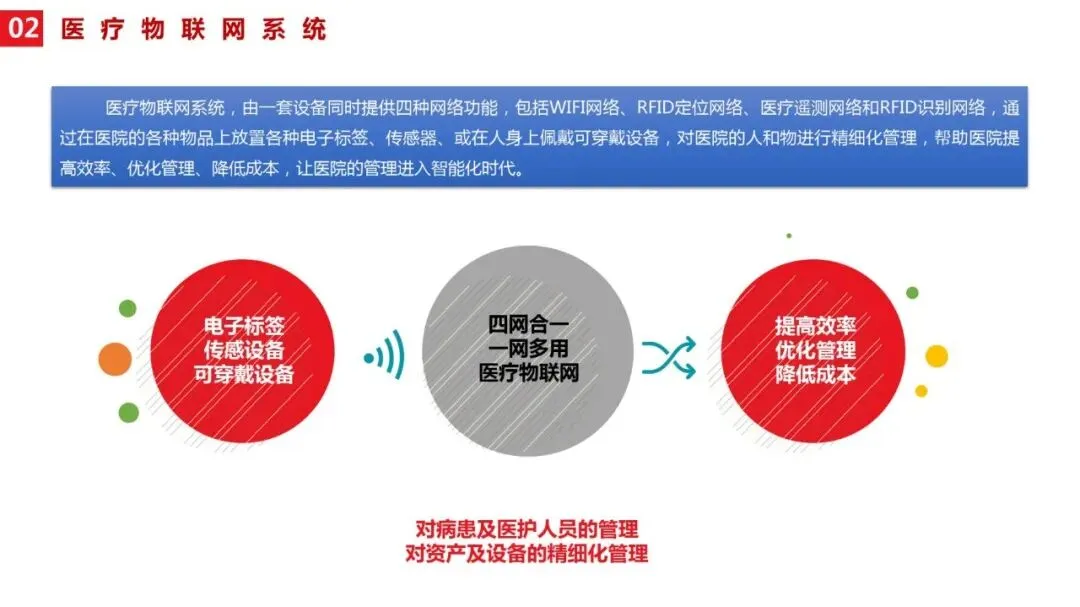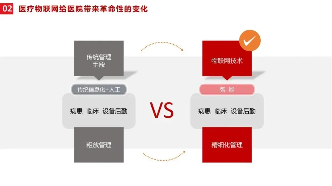需要明确的是,医院智慧医疗与传统医疗信息化、数字医疗存在本质区别:传统医疗信息化侧重“数据记录”,而智慧医疗侧重“智能应用”;数字医疗多为单点技术突破,而智慧医疗强调系统集成、信息共享与全流程优化,是物联网在医疗卫生领域应用的更高阶段。