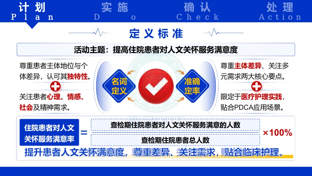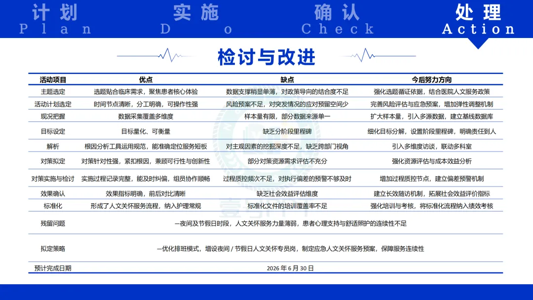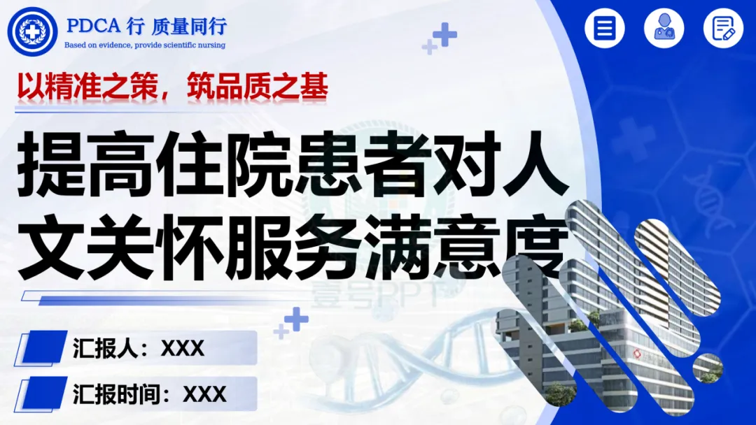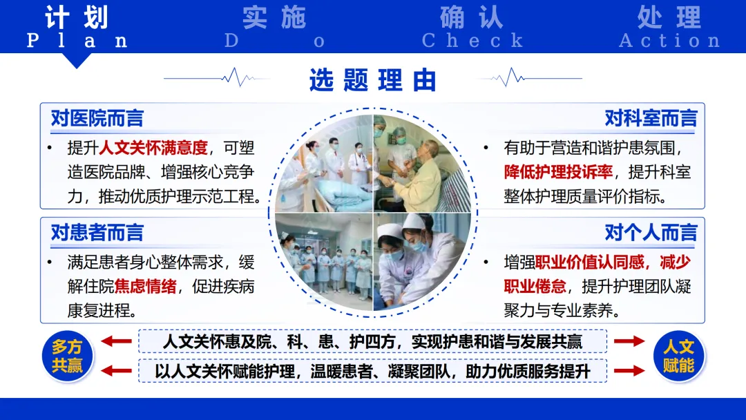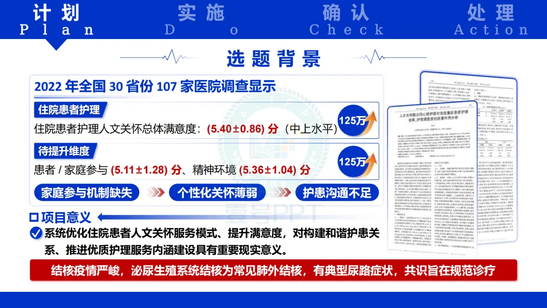 《提高住院患者对人文关怀服务满意度》质量改进PDCA项目是一份非常有特色的护理人文关怀,在众多以技术操作为主的参赛项目中独树一帜。以下是选题可获奖的点和演讲注意事项分析: