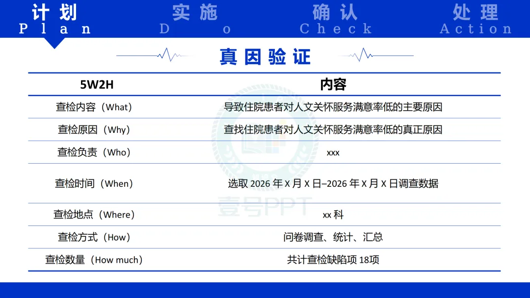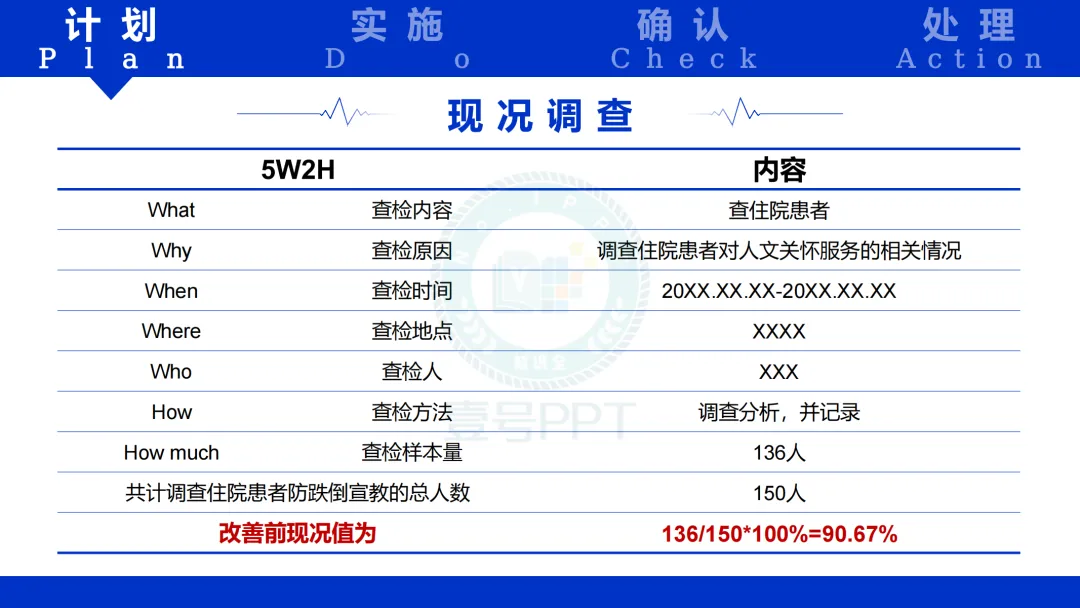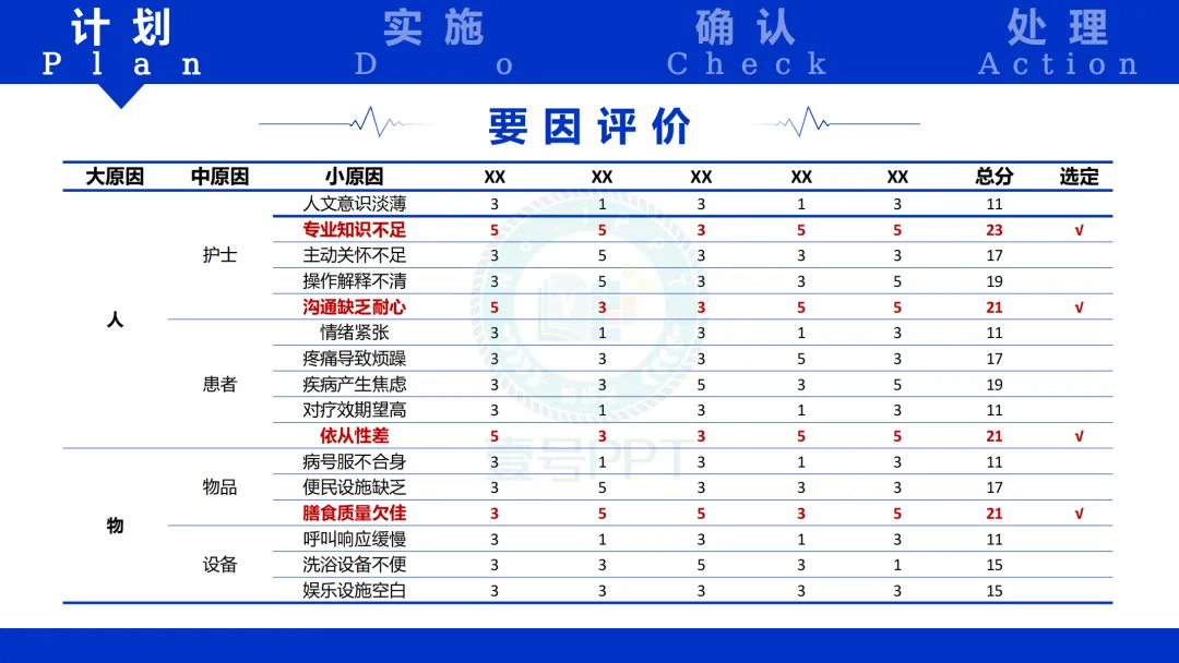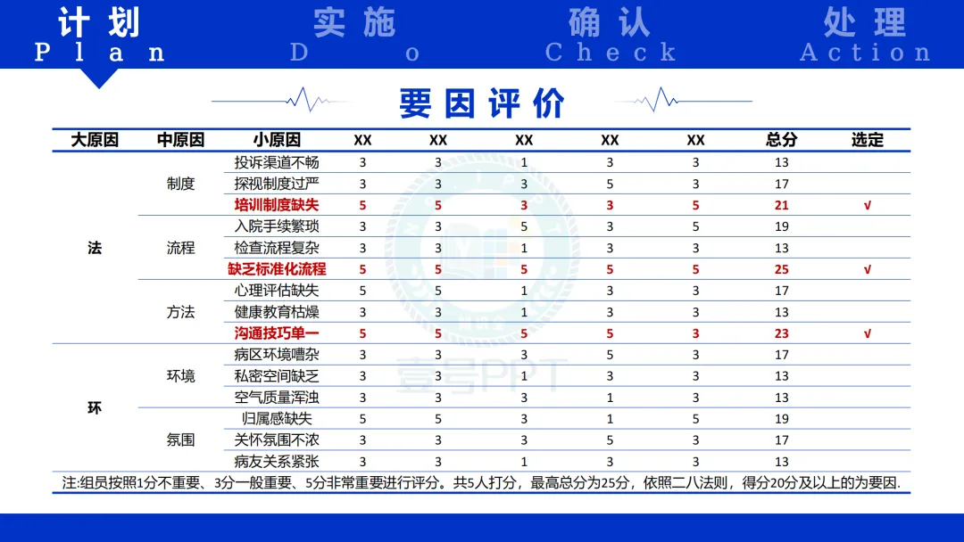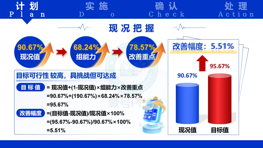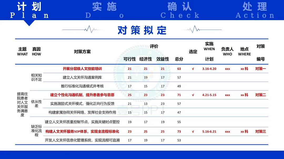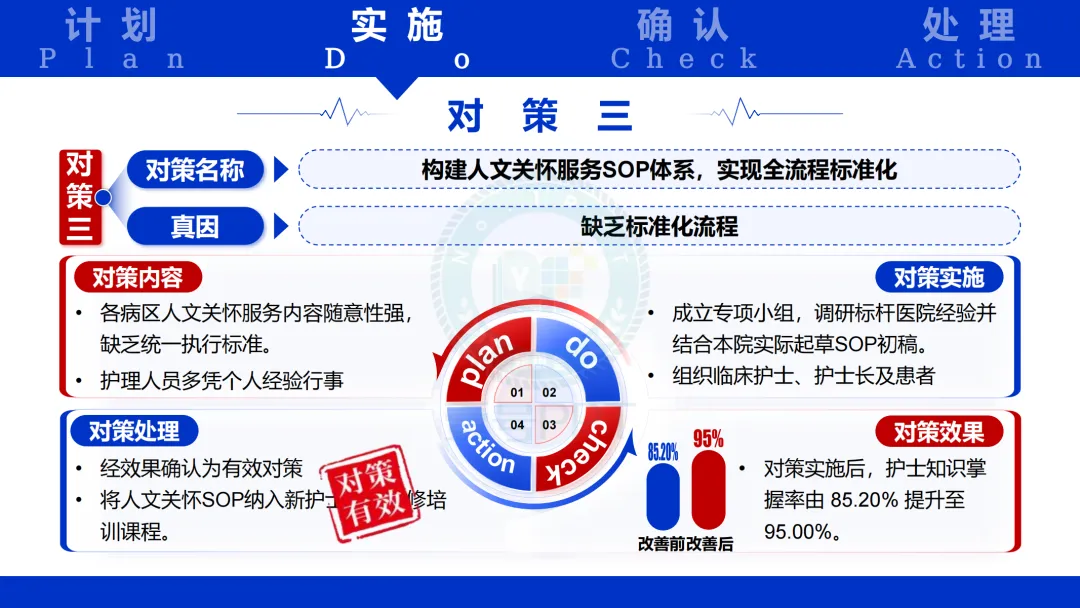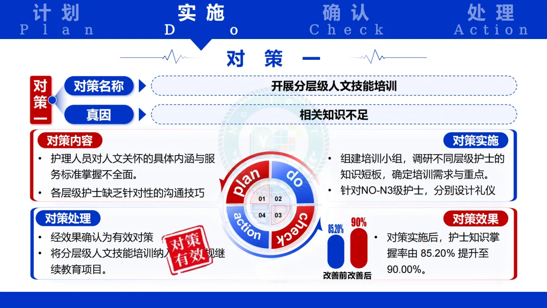 选题价值 | 选题聚焦人文关怀,满意度90.67%→目标95.67%;三大真因:知识不足、依从性差、缺标准化流程。 |