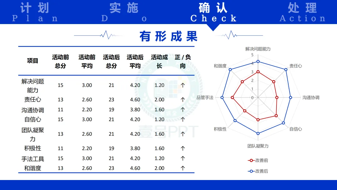 无形成果:团队解决问题能力、责任心、沟通协调、自信心等全面提升(雷达图清晰展示)