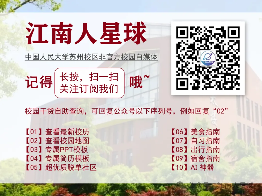 获取方式:扫码关注【江南人星球】后台回复: 中国人民大学苏州校区