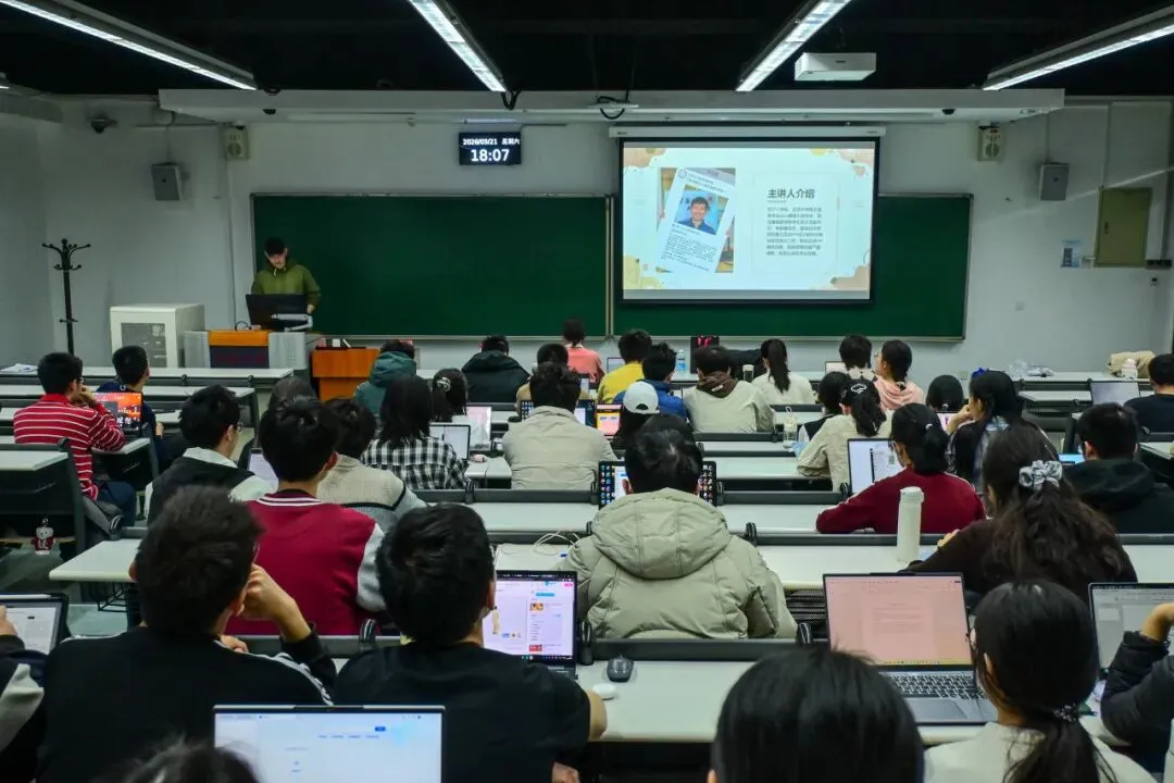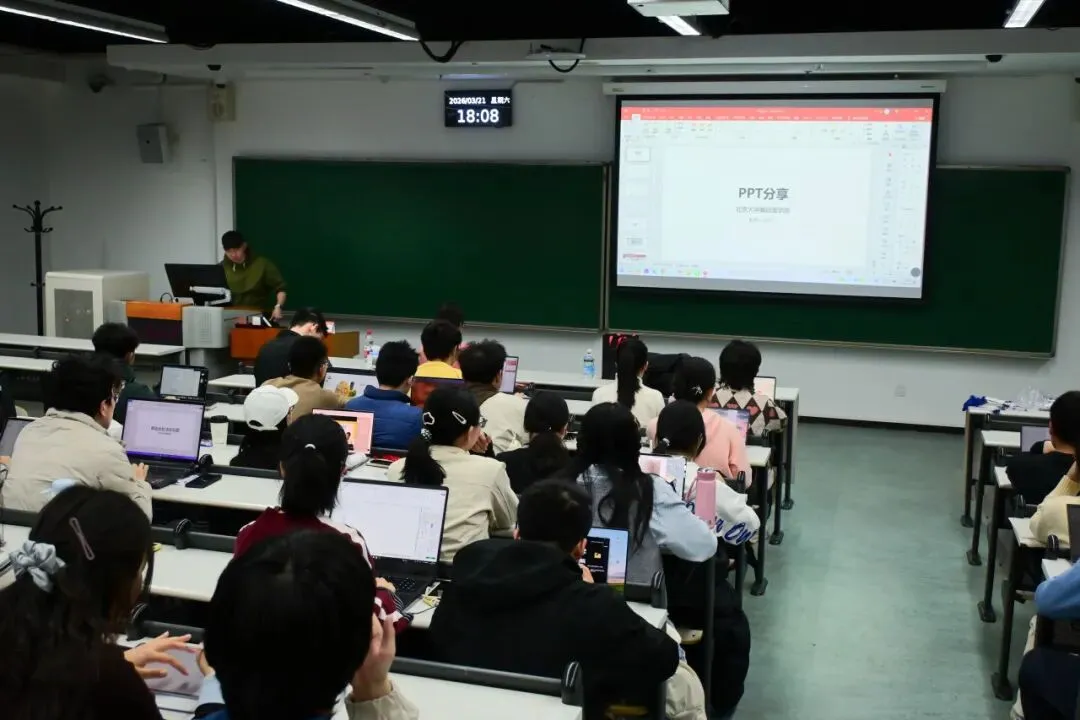 最后,学长结合自己曾制作的真实案例,带领大家一步步拆解优秀PPT背后的设计思路。从封面如何抓住眼球,到内页如何构建逻辑层级,再到结尾如何收束有力,学长将抽象的设计理念落实到具体页面的每一个细节中。同学们在实例中真切感受到,一份好的PPT,不仅是美观的呈现,更是逻辑与表达的深度融合。