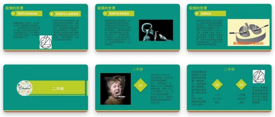PPT内从吸烟行为的发展历史切入,循序渐进讲解烟草烟雾的核心有害属性,拆解吸烟行为对人体多维度机能的影响,逻辑清晰易于理解。