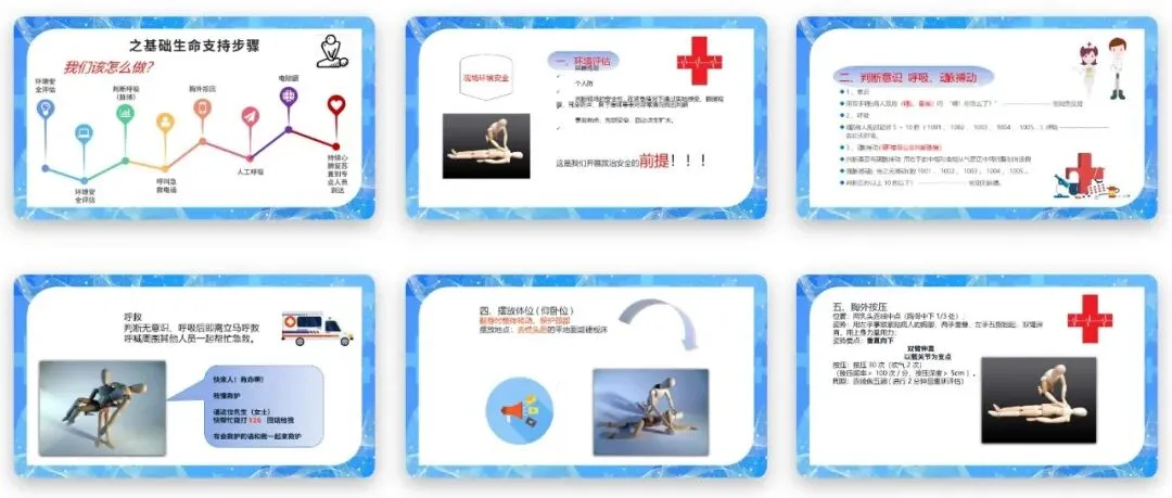 针对院外施救的完整流程,PPT做了全链条的拆解讲解,从现场环境安全评估、患者状况判断、规范呼救,到胸外按压、开放气道、人工呼吸的规范操作。