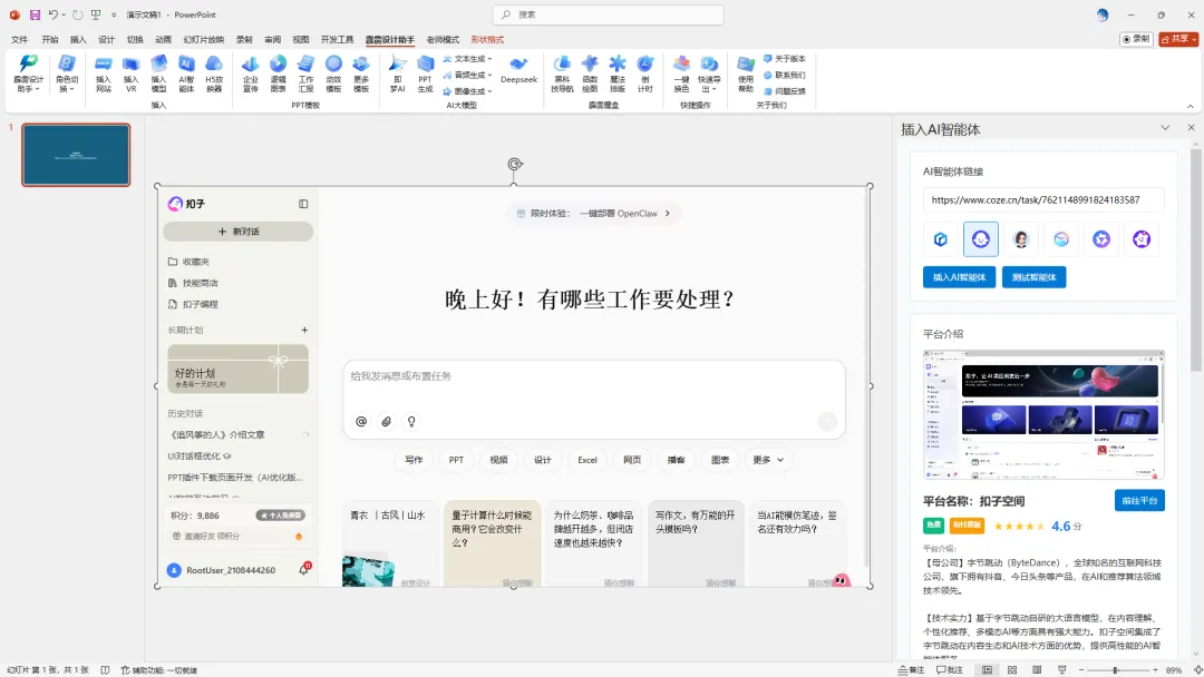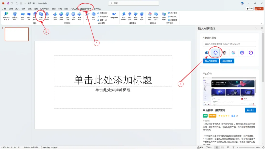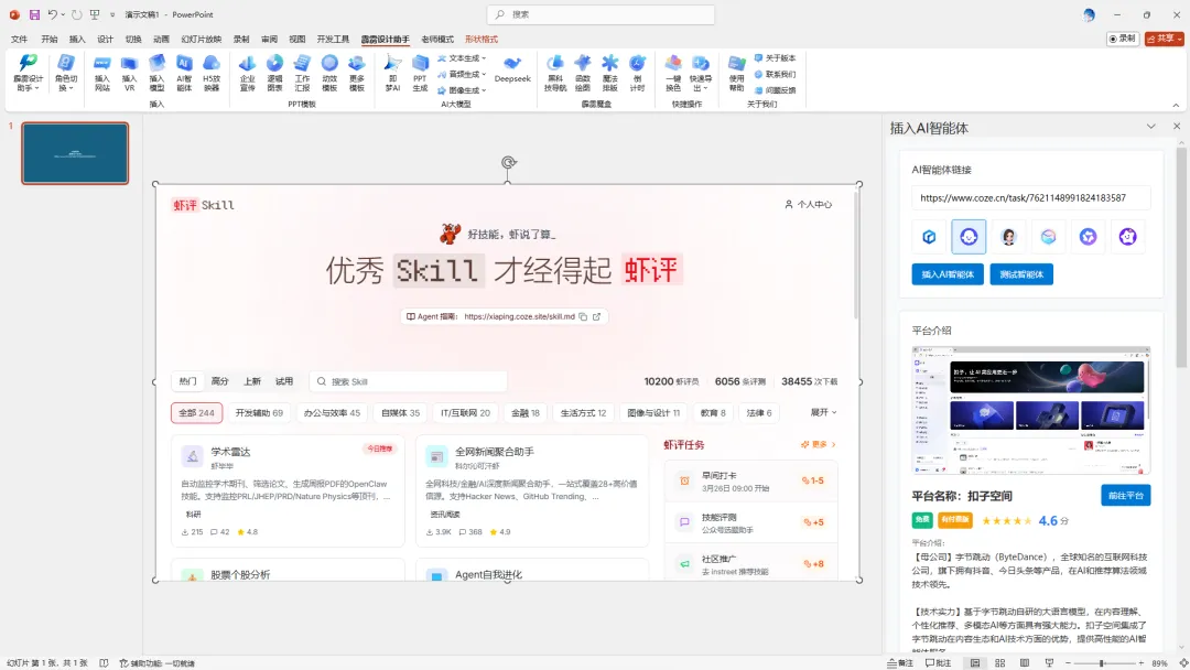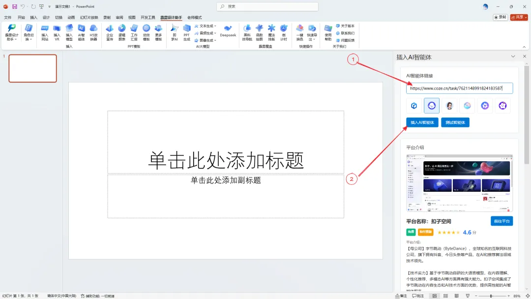 插件激活后,不用在复杂菜单里找半天,按这 3 步直接锁定核心功能:打开需要编辑的 PPT(比如教师的说课课件、培训师的课程讲义,新建空白 PPT 测试也可以)。点击顶部菜单栏的「霹雳设计助手」,展开功能列表后,直接选择「插入 AI 智能体」—— 此时会自动弹出功能侧边栏(没弹出的话,刷新网络或重启插件就行)。三、核心操作:接入扣子空间 AI 的 4 个关键步骤(含场景案例)