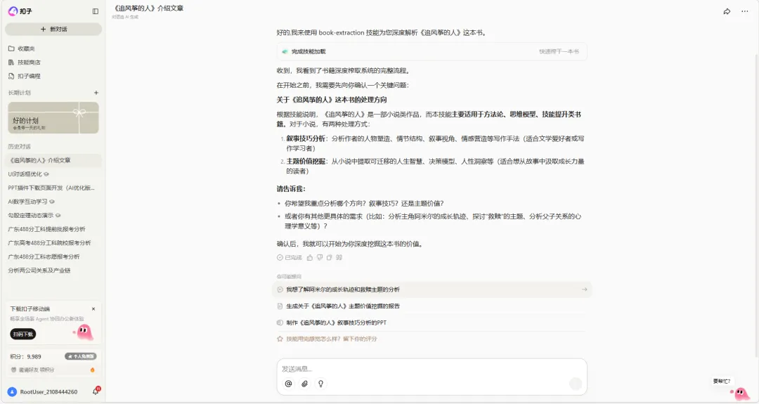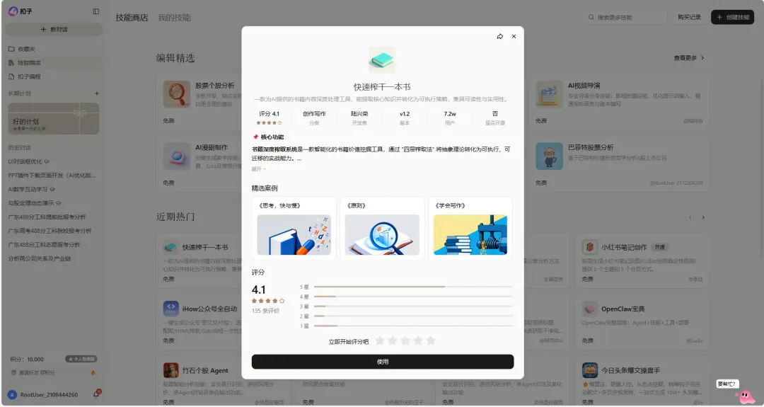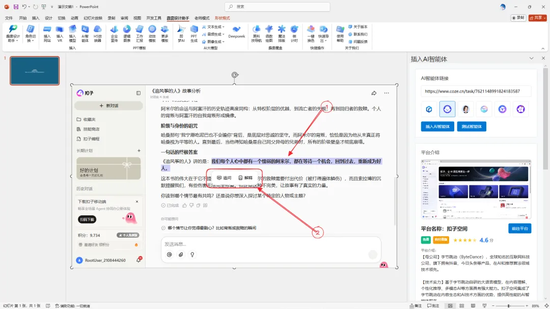 PPT接入 AI 后,你的 PPT 不再是冰冷的页面集合 —— 教师的说课课件能实时回应评委疑问,培训师的讲义能按需补充知识延伸,甚至产品发布会的 PPT 能自动解答客户关于行业案例的提问。像 “快速榨干一本书” 这样的智能体,只是扣子商城的冰山一角。无论是教学、职场还是营销场景,都能找到适配的 AI 工具,通过 PPT 嵌入实现 “双向互动”。不用复杂技术,跟着上面的步骤操作,下次演示绝对让人眼前一亮!