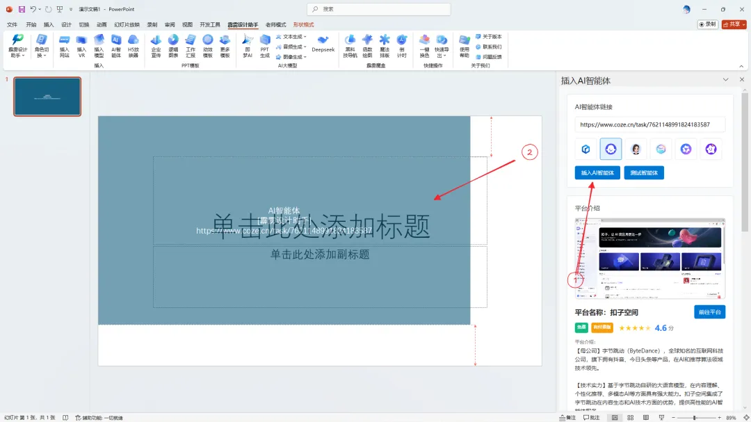 点击「插入 AI 智能体」按钮,PPT 编辑区会出现占位符 —— 上面显示智能体链接,确认无误后即可进行下一步。